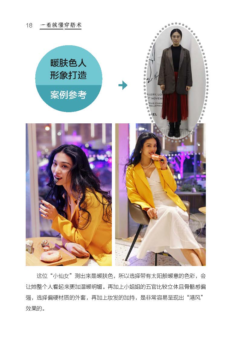 書中開篇是穿搭的基礎(chǔ),即了解自己的膚色,冷暖膚色在服裝及彩妝色彩的選擇上大有不同。第二章到第五章進(jìn)入主題,詳細(xì)講述穿搭配色、技巧與風(fēng)格。無論是在自然、名畫中找靈感,還是介紹穿搭的節(jié)奏感,或是如何通過服飾彌補身材的不足,都能讓你一看就懂,一學(xué)就會。第三部分介紹了發(fā)型和配飾應(yīng)該如何選擇,為你打造出彩的形象。