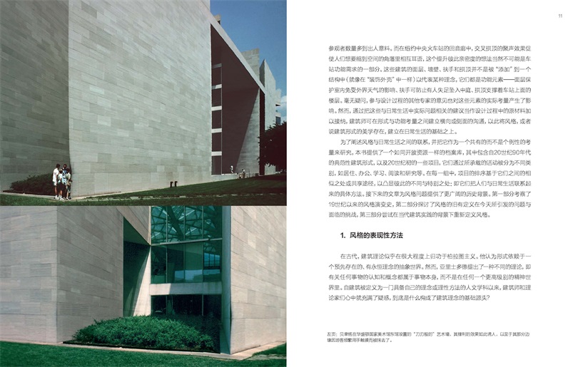 《風(fēng)格的功能》通過展現(xiàn)不同的建筑形式,介紹了當(dāng)代建筑風(fēng)格功能的組成要素。人們常認(rèn)為風(fēng)格僅僅是建筑外觀表現(xiàn),可以隨意修改,但是作者卻不這樣認(rèn)為。作者將建筑比作一個(gè)錯(cuò)綜復(fù)雜的網(wǎng)絡(luò)系統(tǒng),其中單個(gè)建筑是從為日常生活的不同活動(dòng)而設(shè)計(jì)的其他建筑中汲取的概念的產(chǎn)物,這些不同的概念進(jìn)一步創(chuàng)造出相互關(guān)聯(lián)而又各不相同的獨(dú)立建筑。建筑風(fēng)格主要在于體現(xiàn)建筑的平面布局、形態(tài)構(gòu)成、藝術(shù)處理和手法運(yùn)用等方面所顯示的意境。