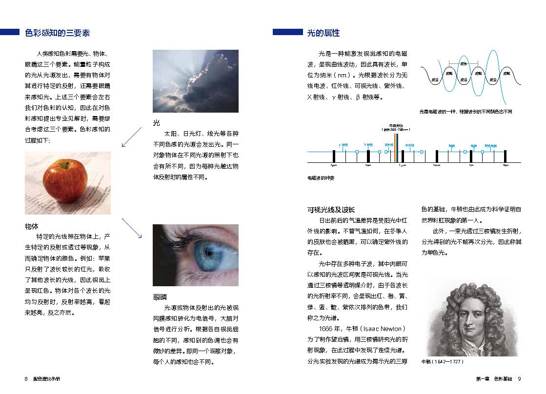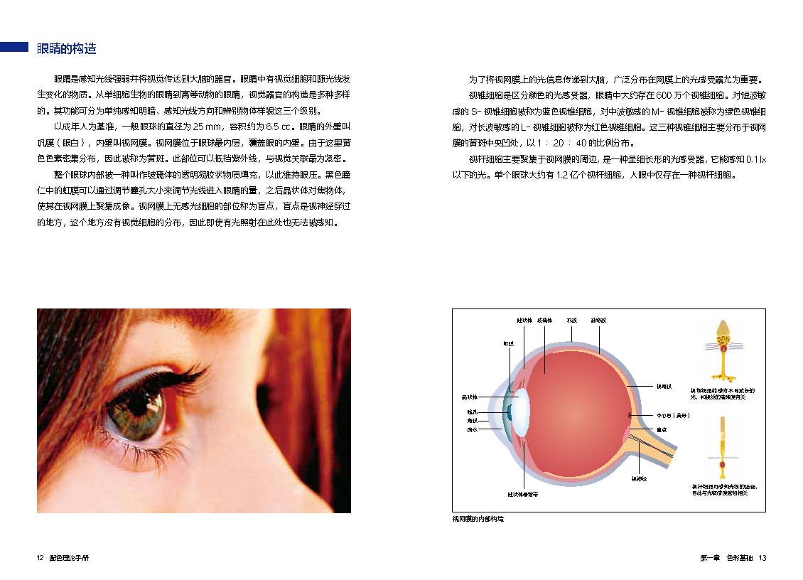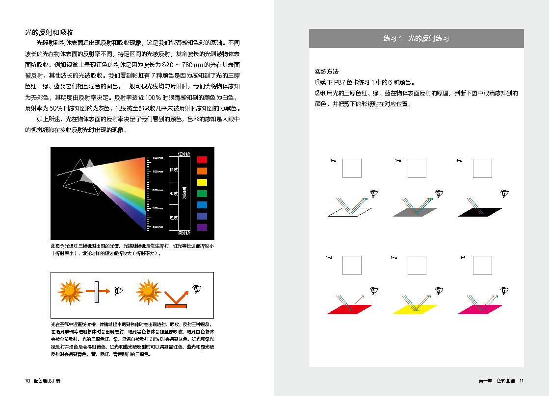 本書為金玟技教授配色手冊(cè)系列圖書的第一本,作者通過這本書把配色理論分成三個(gè)部分。第一部分是講色彩的基礎(chǔ)知識(shí),從色彩的三原色和光的屬性講起。作者詳細(xì)解釋了人眼的構(gòu)造和色彩的屬性分類。第二部分是講色彩的理論,講解了色彩的命名方式和孟德爾顏色系統(tǒng)、奧斯特瓦爾德顏色系統(tǒng)和CIE顏色系統(tǒng)等幾大色彩系統(tǒng)。第三部分內(nèi)容講解了色彩的混合,包括加色混合、減色混合和中間色混合。作者在每章節(jié)后都留有練習(xí)題和答案,方便讀者更好地理解運(yùn)用色彩的理論知識(shí),鞏固之前的記憶。