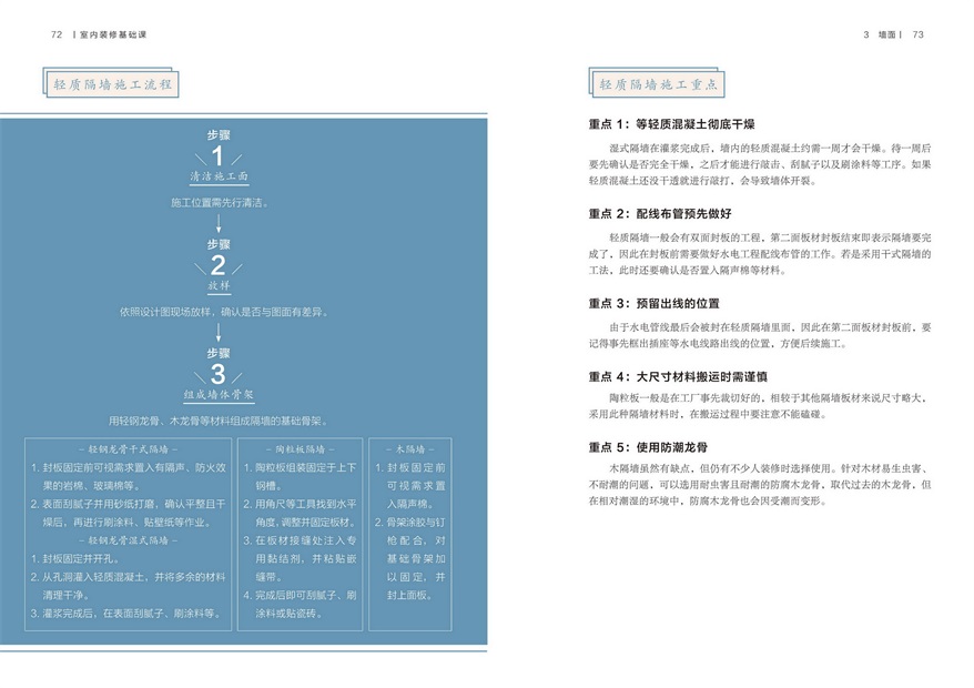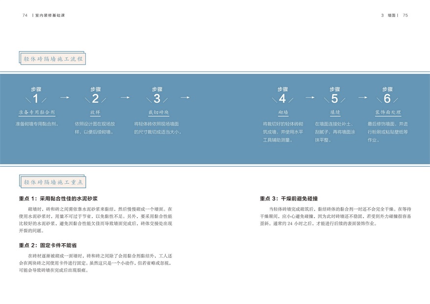 以空間內(nèi)部6個板塊(頂面、地面、墻面、照明、涂料和定制家具)講解室內(nèi)裝修施工的流程及要點,并對裝修中常見問題進行解答。