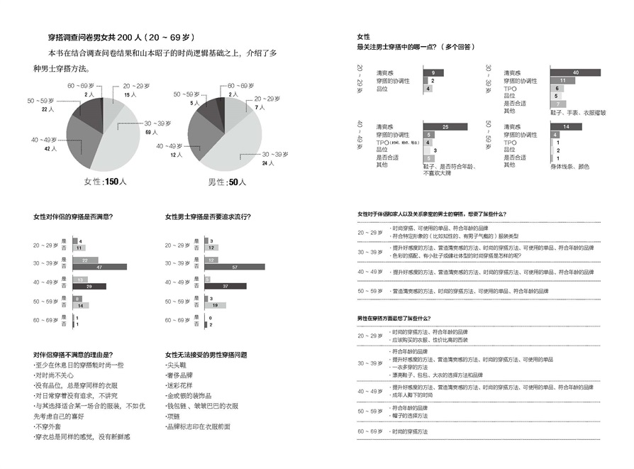 本書由日本人氣造型師結(jié)合問(wèn)卷調(diào)查結(jié)果編寫,調(diào)查并總結(jié)出在女性眼中什么樣穿搭的男性更有吸引力,什么樣的穿搭給人印象不好,自己更關(guān)注男友或丈夫衣著的哪些細(xì)節(jié)等。是一本一看就懂的男士穿搭基礎(chǔ)原理圖解。全書共分為三章節(jié),第一章介紹了十件每位男士都一定要有的單品,比如黑色西裝外套、白色T恤、小白鞋等,告訴男性讀者如何更快速的搭配好這十件基礎(chǔ)品。第二章分為三個(gè)小節(jié),分別為休閑穿搭、工作穿搭、服裝配色,內(nèi)容更加實(shí)用。第三章內(nèi)容為應(yīng)對(duì)各季節(jié)特定活動(dòng)場(chǎng)合的穿搭推薦,比如春季賞花踏青的穿搭推薦、夏季和伴侶出行的穿搭、秋季公司秋招的商務(wù)穿搭、冬季春節(jié)回家的穿搭等。
