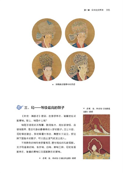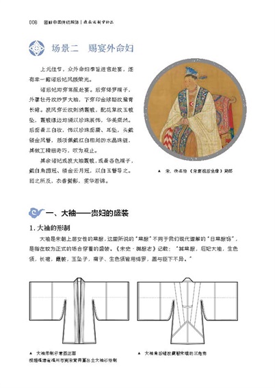 本書(shū)以宋代絹本畫(huà)為主要藍(lán)本,以宋代壁畫(huà)為輔,搭建了33個(gè)場(chǎng)景,大到謁廟朝會(huì)、宮宴雅集,小到燕居侍花、耕織斗茶。嘗試在特定情境的代入中,闡述命婦仕女、士宦富賈、少年兒童以及庶民百工不同群體的妝束,既涵蓋巾帽冠帶、衫袍鞋服,又包括發(fā)型妝容、紋樣配飾。此外,結(jié)合漢服在當(dāng)代生活中的應(yīng)用需求,搭建了5個(gè)虛擬場(chǎng)景。通過(guò)古籍文獻(xiàn)的考證,呈現(xiàn)宋代冠禮、及笄禮、婚禮的流程以及所穿服飾、所用配飾。