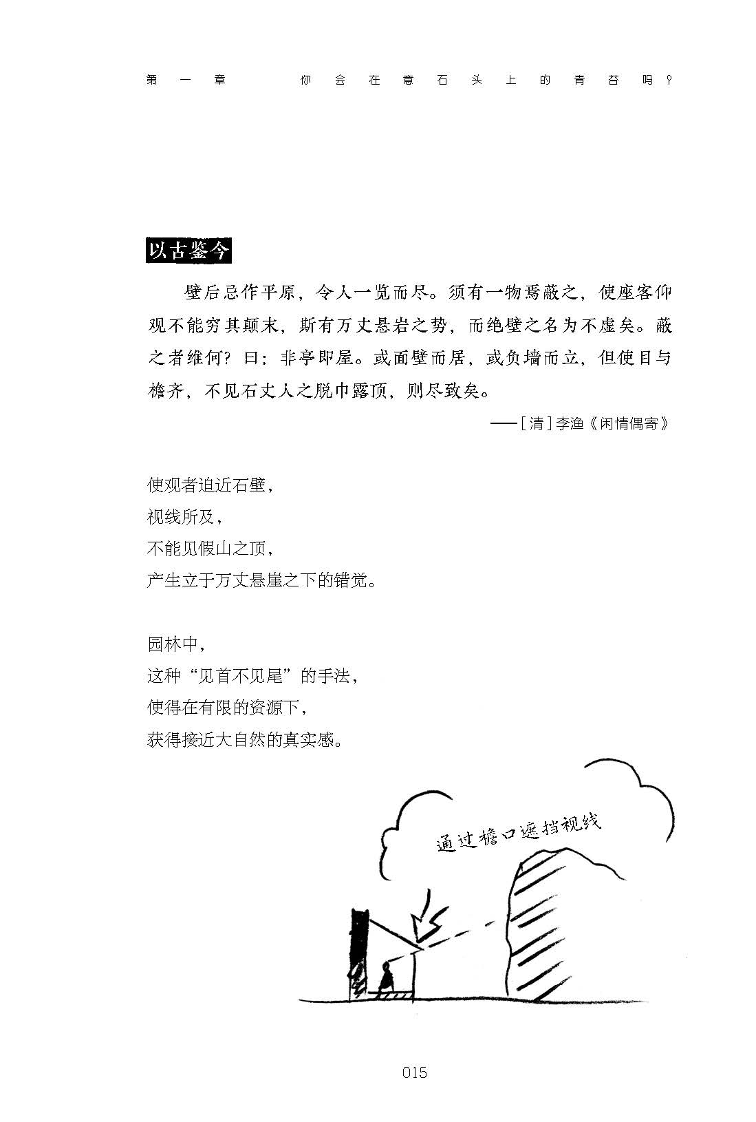 本書(shū)的開(kāi)篇聚焦于古老東方的審美傳統(tǒng),從古詩(shī)文中發(fā)掘文人雅士如何運(yùn)用花、石、草、木等自然材料構(gòu)建出“方寸之內(nèi)有乾坤”的庭院景觀,寄托自己的情思與志向。然后將視角轉(zhuǎn)向庭院營(yíng)造的邏輯理念,分析其背后隱藏著的房子與自然、與生活之間的關(guān)系。再?gòu)娜祟?lèi)共通的基本需求入手,分析一些古而有之的建筑景觀,現(xiàn)代獨(dú)特的藝術(shù)設(shè)計(jì)是如何迎合并滿足這些基本需求的。結(jié)尾則選取若干當(dāng)代知名的建筑師及其設(shè)計(jì)理念,從細(xì)處入手拆解這些理念背后對(duì)美的表達(dá)方式。