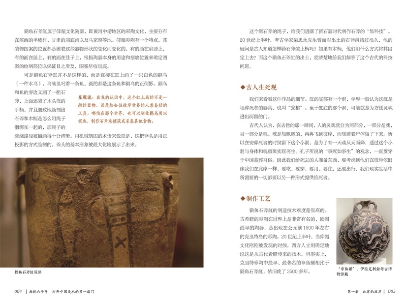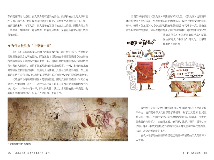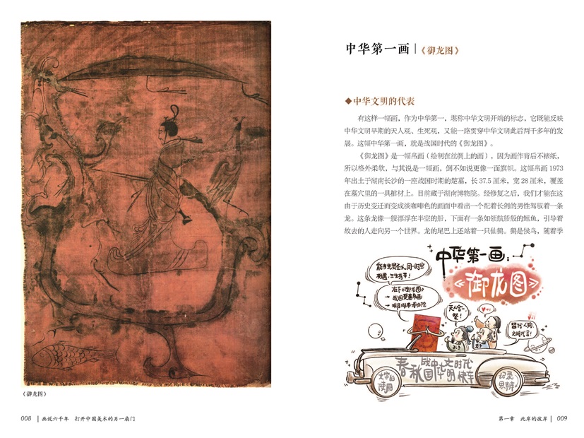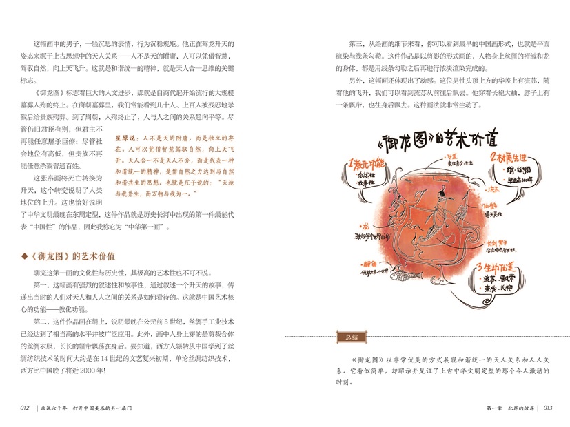 全書共分七章,第一章主要介紹了鸛魚石斧缸、御龍圖等展現(xiàn)古人生死觀的器物,探討中華民族追憶先祖這一文化習俗的歷史淵源。第二章細致講解了敦煌五百強盜成佛因緣圖壁畫、云岡大佛等佛教藝術(shù)在我國古代的發(fā)展。第三、四章圍繞宮廷藝術(shù)品,探討包括《女史箴圖》《韓熙載夜宴圖》等體現(xiàn)古代帝王生活樣貌的畫作。第五章借山水畫,介紹作品與畫家間的關(guān)系,展現(xiàn)了作者的精神面貌與思想。第六章詳細介紹了《珊瑚筆架圖》《容膝齋圖》等藝術(shù)作品對新的書畫語言的探索與使用,展現(xiàn)了那些表達個性與特定感情的書法作品和文人畫接近19世紀起源于歐洲的現(xiàn)代藝術(shù)運動的藝術(shù)形式,也就是古代的現(xiàn)代。第七章則介紹了以《搜盡奇峰打草稿》《千巖萬壑圖》為代表的17—19世紀具有獨創(chuàng)性的中國藝術(shù)作品,它們的出現(xiàn)打破了當時中國藝術(shù)上保守陳舊的局面,創(chuàng)造了又一波中國美術(shù)創(chuàng)作的高光時刻。