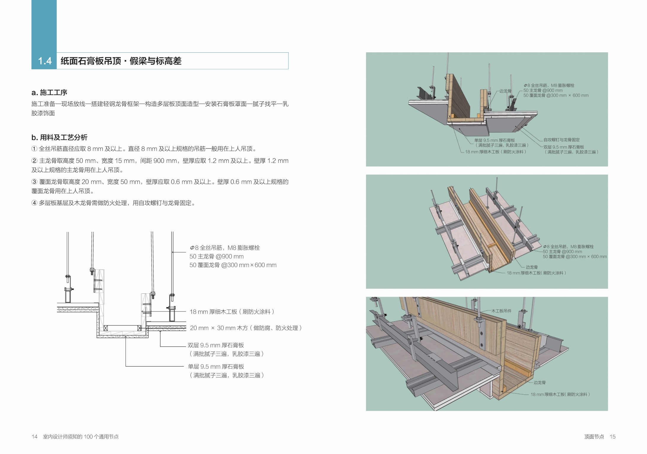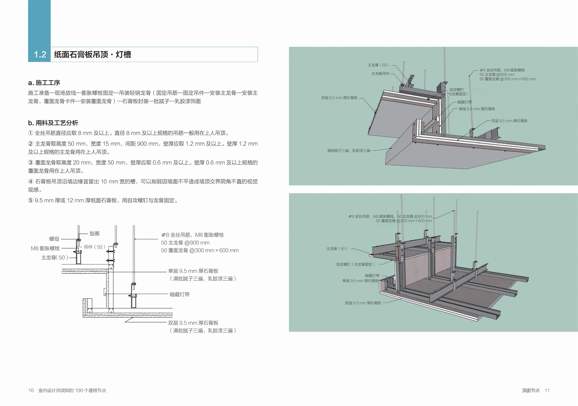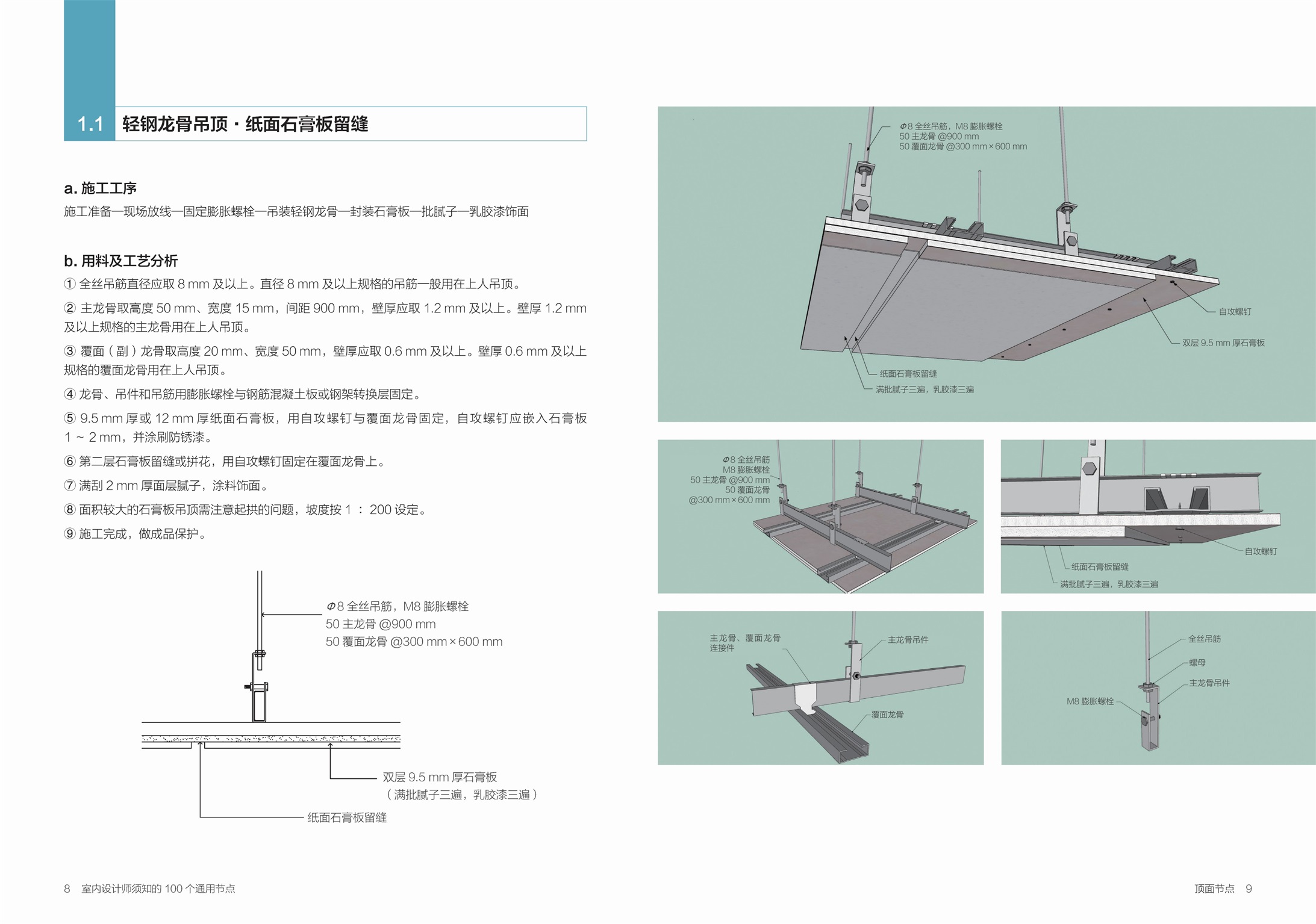 本書共分為三章,總共100多個節(jié)點:第一章介紹35個頂面節(jié)點,比如輕鋼龍骨吊頂、木飾面吊頂、空調(diào)風管、石膏板多疊級棚面、玻璃燈箱等的節(jié)點用料及工藝分析;第二章介紹27個地面節(jié)點,比如地磚鋪貼、地熱、沐浴間石材內(nèi)下水槽、推拉門地思等的節(jié)點用料及工藝分析;第三章介紹42個墻面節(jié)點,比如輕鋼龍骨隔墻工藝構造、實木掛板、輕體墻及木飾面與石材踢腳線、復合墻板與白鋼包口線等的節(jié)點用料及工藝分析。每個節(jié)點有解析,解析包括施工工序、工料分析兩部分,有CAD圖紙,還有SU模型圖,圖文配合說明,讓讀者對節(jié)點結構、工藝一目了然。