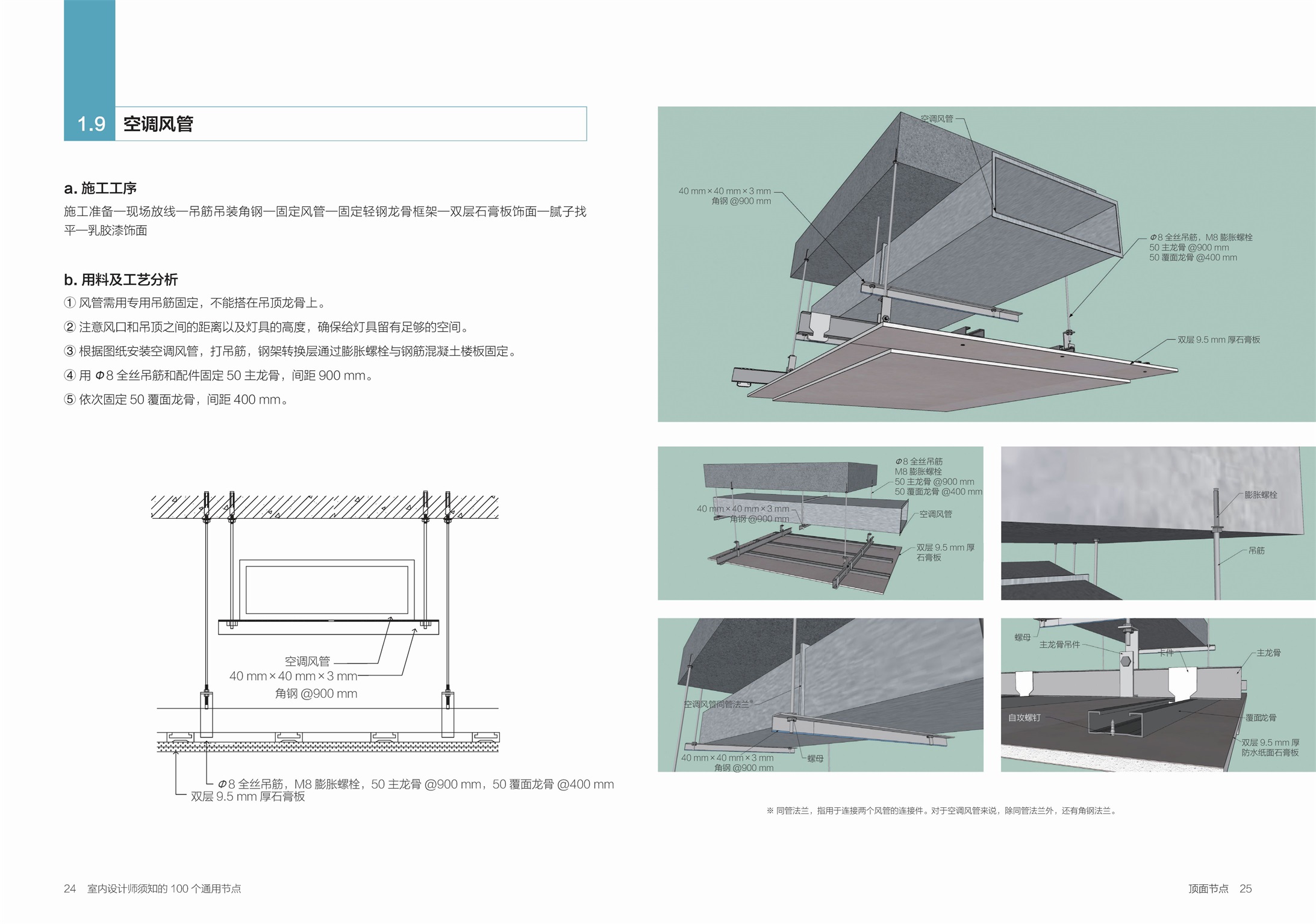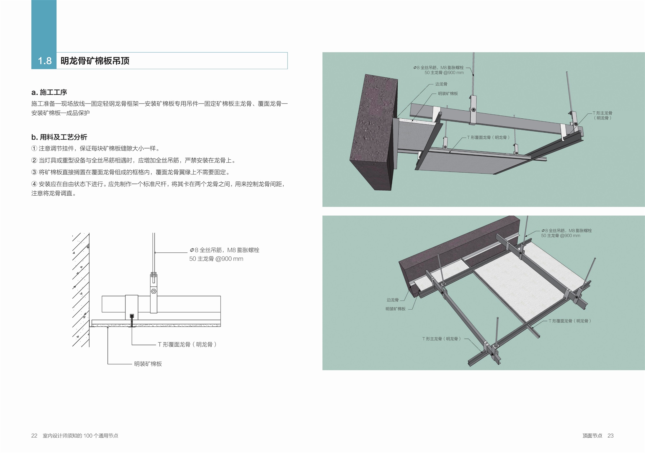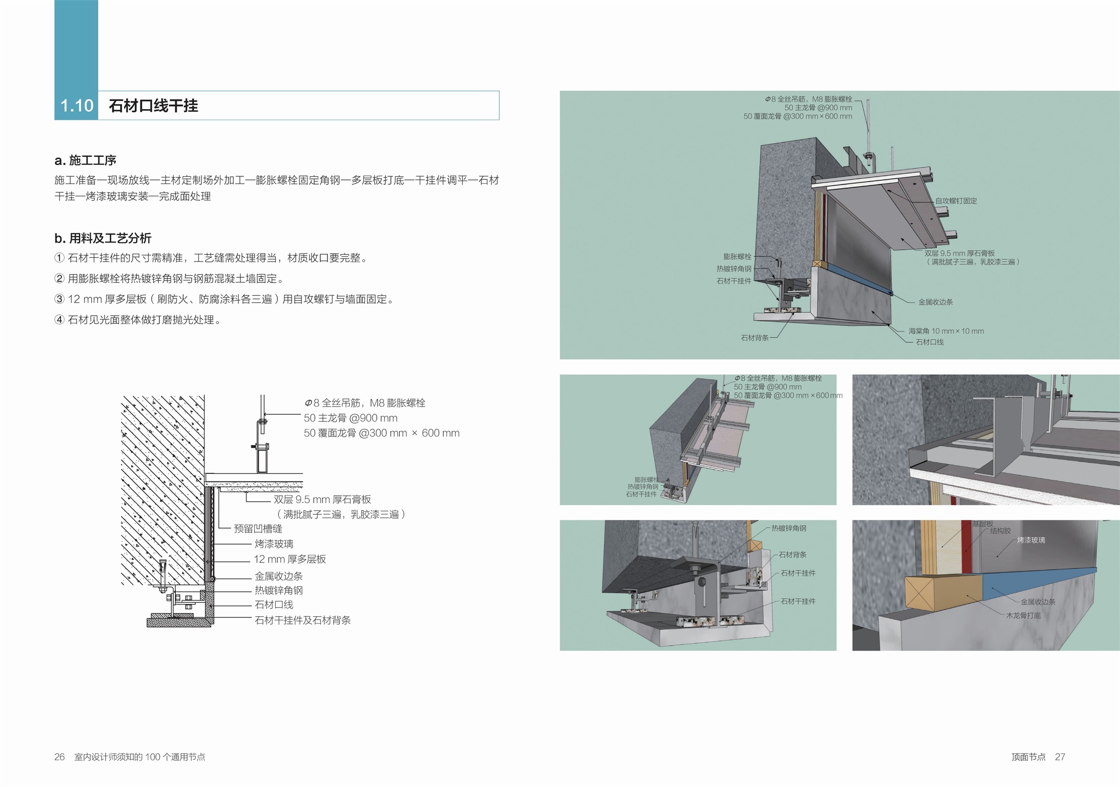 本書共分為三章,總共100多個節(jié)點:第一章介紹35個頂面節(jié)點,比如輕鋼龍骨吊頂、木飾面吊頂、空調(diào)風管、石膏板多疊級棚面、玻璃燈箱等的節(jié)點用料及工藝分析;第二章介紹27個地面節(jié)點,比如地磚鋪貼、地熱、沐浴間石材內(nèi)下水槽、推拉門地思等的節(jié)點用料及工藝分析;第三章介紹42個墻面節(jié)點,比如輕鋼龍骨隔墻工藝構造、實木掛板、輕體墻及木飾面與石材踢腳線、復合墻板與白鋼包口線等的節(jié)點用料及工藝分析。每個節(jié)點有解析,解析包括施工工序、工料分析兩部分,有CAD圖紙,還有SU模型圖,圖文配合說明,讓讀者對節(jié)點結構、工藝一目了然。