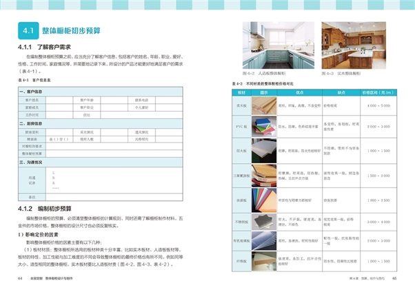本書從整體櫥柜的概念、發(fā)展等內(nèi)容入手,逐一介紹整體櫥柜設(shè)計基礎(chǔ),預(yù)算、報價與簽約,整體櫥柜材料與構(gòu)造,整體櫥柜制作工藝,現(xiàn)代廚房收納設(shè)計,廚房水電布置安裝,整體櫥柜安裝方法,整體櫥柜維護(hù)保養(yǎng)等一系列知識。通過表格、數(shù)據(jù)分析、對比圖、圖文解析、小貼士等,介紹整體櫥柜設(shè)計與制作的每一個環(huán)節(jié),是一本一看就能懂的零基礎(chǔ)整體櫥柜設(shè)計與制作全書!