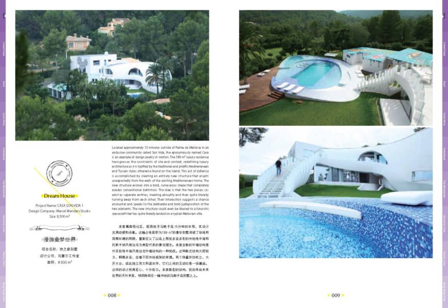 《世界豪宅地圖》收錄了大量來(lái)自世界各地的豪宅設(shè)計(jì)的最新精彩案例,包括美國(guó)、西班牙、巴西、瑞士、荷蘭等。現(xiàn)代室內(nèi)空間設(shè)計(jì),尤其是別墅設(shè)計(jì),是設(shè)計(jì)師們探索的重點(diǎn),它要求在奢華之中體現(xiàn)空間的文化意蘊(yùn)和內(nèi)涵,給居住者精神上的享受。豪宅的設(shè)計(jì)在于能體現(xiàn)居住者的高品位,以及深厚的歷史文化根基和傳統(tǒng)。