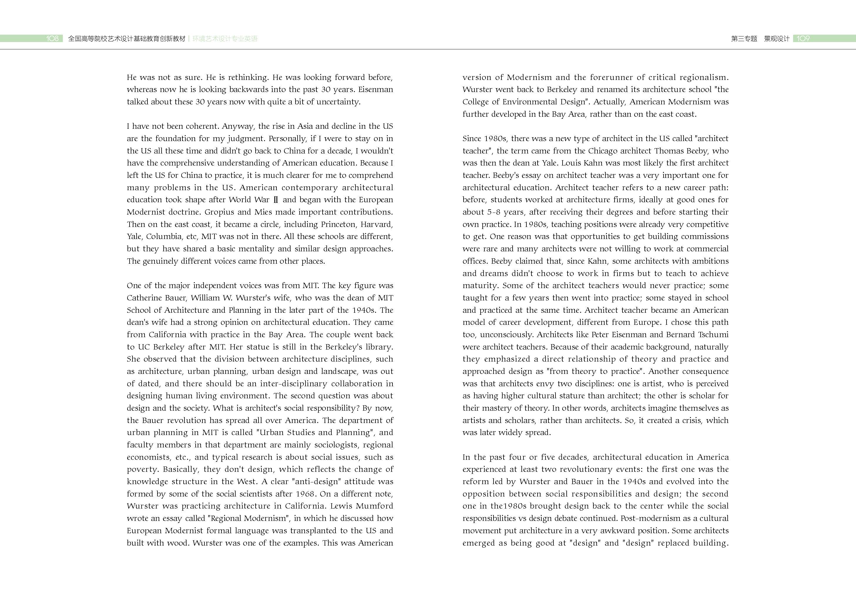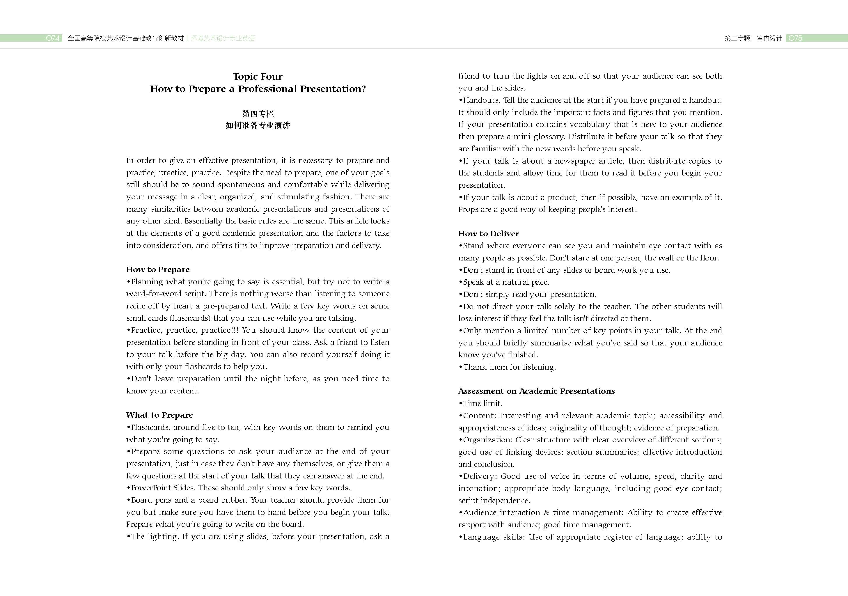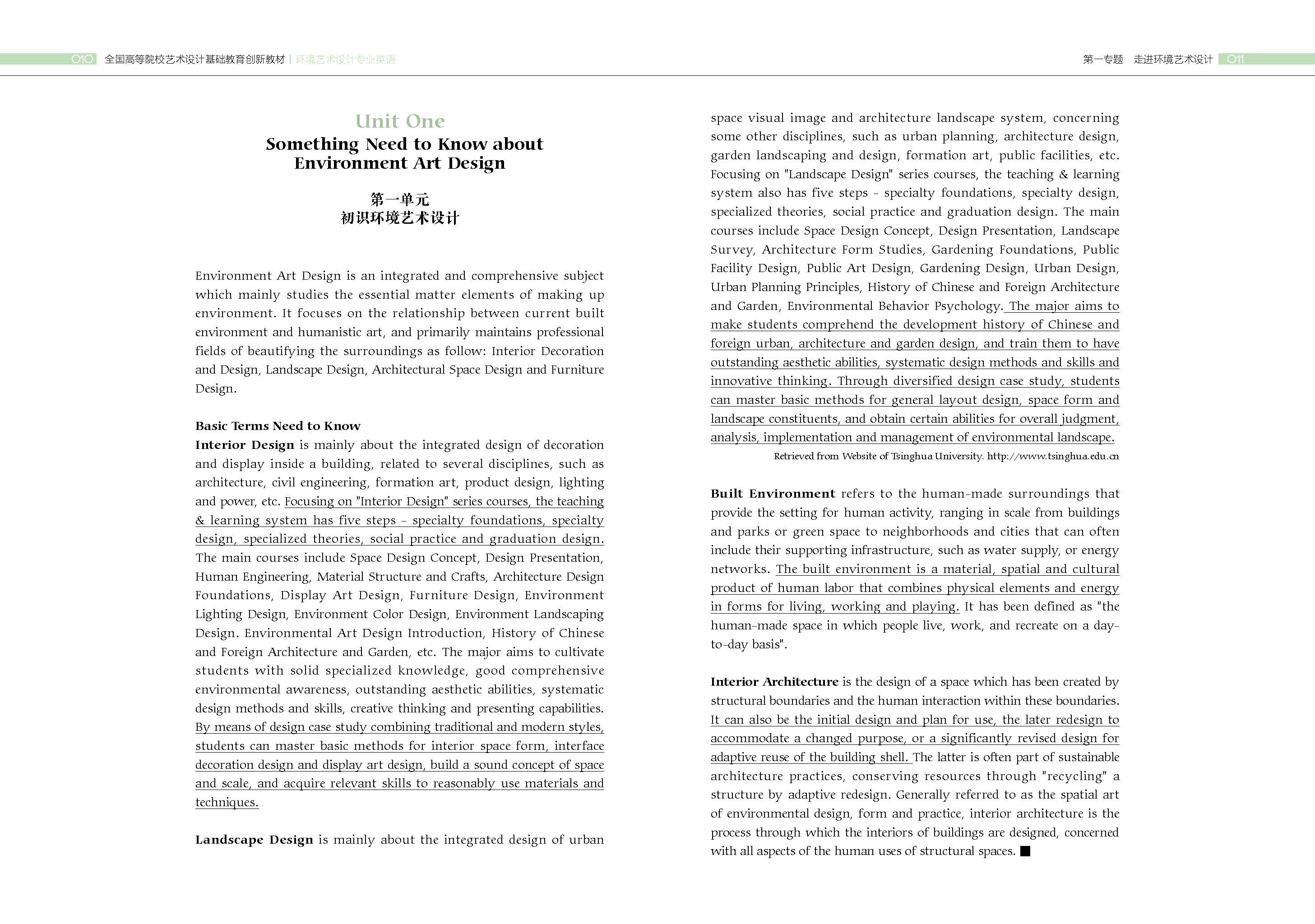 教材內(nèi)容主要分為專業(yè)文獻(xiàn)和課后專欄兩個部分。其中專業(yè)文獻(xiàn)部分為走進(jìn)環(huán)境藝術(shù)設(shè)計(jì)、室內(nèi)設(shè)計(jì)、景觀設(shè)計(jì)、建筑設(shè)計(jì)以及其他相關(guān)領(lǐng)域五個專題,共17個單元。所列專業(yè)文獻(xiàn)均摘自國內(nèi)外優(yōu)秀案例,圖文并茂,增加了教材的實(shí)踐性、可讀性和趣味性。課后對文章中的涉及的專業(yè)詞匯了做出了注解,將穩(wěn)中重點(diǎn)句子以英譯漢的形式讓學(xué)生進(jìn)行鞏固理解,并針對文章內(nèi)容提出思考題,以便讓學(xué)生用英文以分組討論的方式進(jìn)行交流溝通,既在專業(yè)層面提高學(xué)生的英文應(yīng)用能力,又通過練習(xí)培養(yǎng)學(xué)生的英文思維能力。