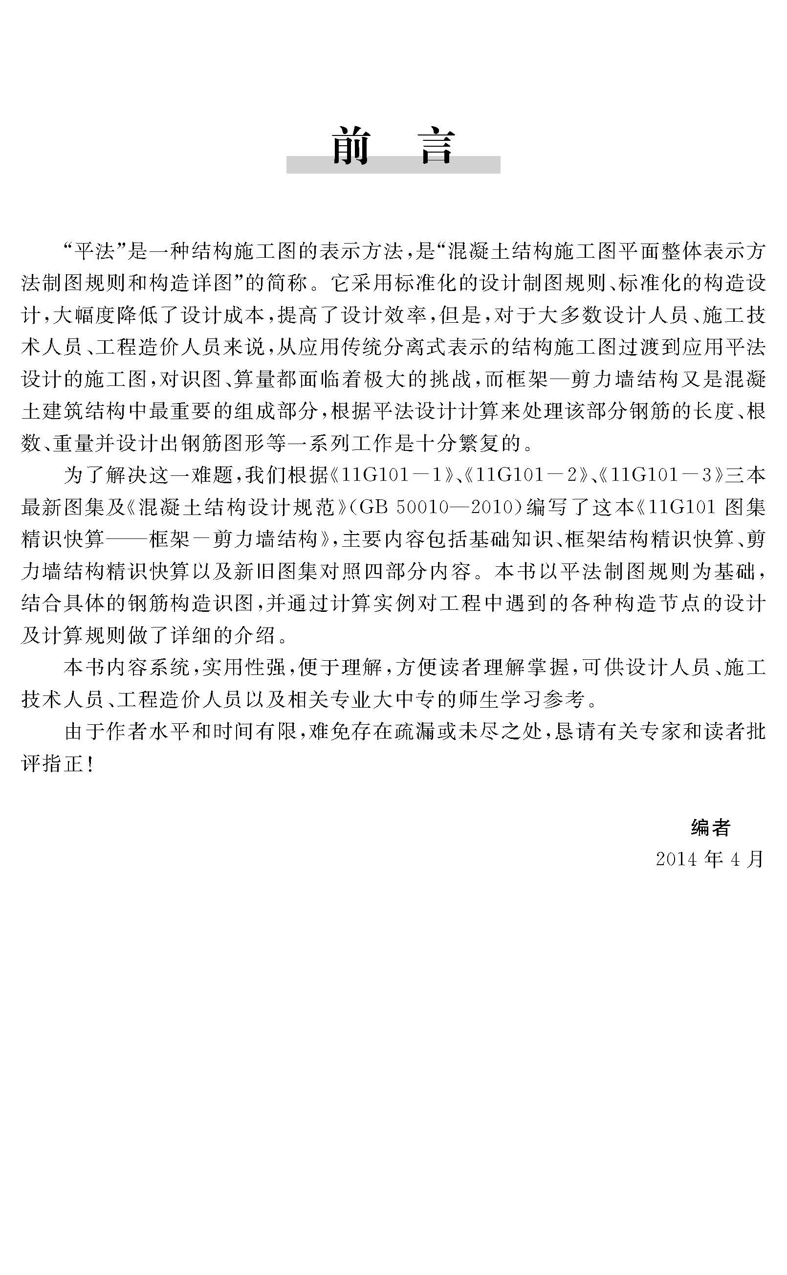 本書以《11G101-1》、《11G101-2》、《11G101-3》三本最新圖集及《混凝土結(jié)構(gòu)設(shè)計規(guī)范》(GB 50010-2010)為主要理論依據(jù),主要內(nèi)容包括基礎(chǔ)知識、鋼筋精 識快算基礎(chǔ)知識、獨立基礎(chǔ)精識快算、條形基礎(chǔ)精識快算、筏形基礎(chǔ)精識快算以及 新舊圖集對照六大部分內(nèi)容,以平法制圖規(guī)則為基礎(chǔ),結(jié)合具體的鋼筋構(gòu)造識圖, 通過計算實例詳細講解了獨立基礎(chǔ)、條形基礎(chǔ)、筏形基礎(chǔ)構(gòu)件的各類鋼筋在實際工 程中的計算要點。