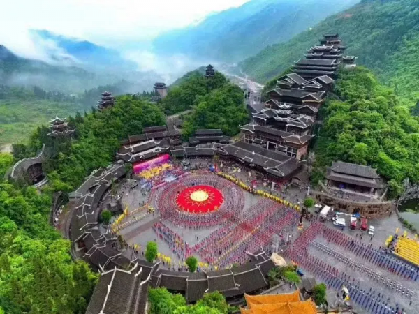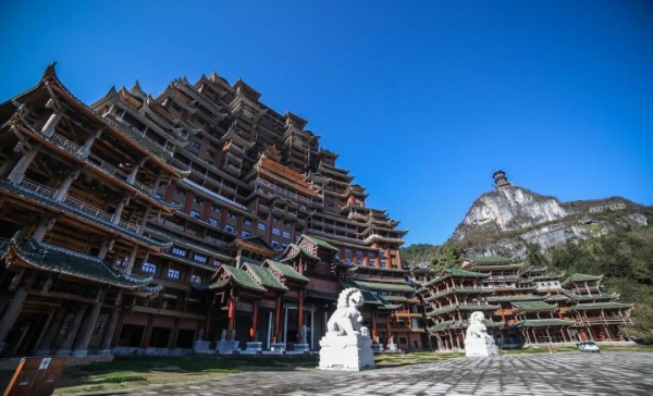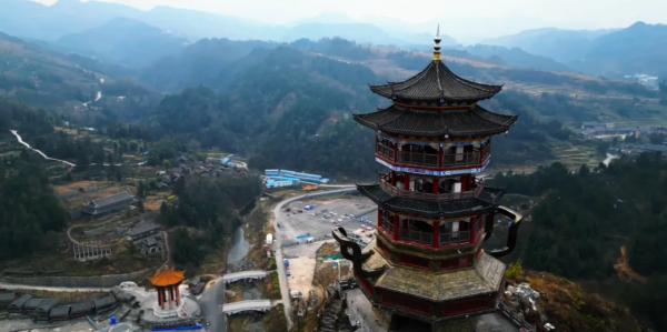 李宏進設計的九黎宮高99米,建筑面積約3萬平方米,是規(guī)模最大的集四合院、吊腳樓、沖天樓為一體的苗族單體建筑,創(chuàng)下三項吉尼斯世界紀錄(圖源:百度百科)