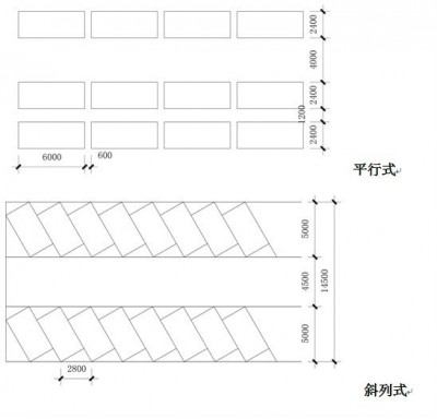 4.停車場的停車方式,根據地形條件以占地面積小、疏散方便、保證安全為原則,主要停車方式有平行式、斜列式、垂直式三種。其中間最小距離以小型車為例,停車方式見下圖