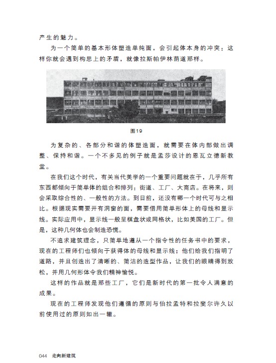 《走向新建筑》闡述了偉大的建筑師勒·柯布西耶的機械美學(xué)理論,以及有關(guān)工業(yè),經(jīng)濟,形式與功能的關(guān)系,“批量生產(chǎn)精神”等觀點。柯布西耶從1920年起,在其主編的《新精神》雜志上連續(xù)發(fā)表論文,提倡建筑的革新,走平民化、工業(yè)化、功能化的道路,提倡相應(yīng)的新的建筑美學(xué)。這些論文匯集為《走向新建筑》一憶,于1923年初版,1924年出增訂的第二版。近一個世紀的歲月流逝并未減損它的光輝。