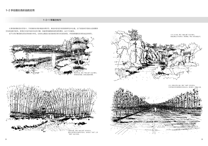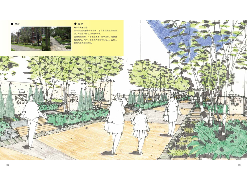 2. 國內(nèi)手繪類景觀作品集較多,但層次不一,比如諸多手繪入門及技巧分析的教程,內(nèi)容多過于單調(diào)。而本書不同于已有圖書,重點在于依據(jù)設(shè)計的自然階段,講解手繪效果圖的意義和技巧,具有更強的參考指導(dǎo)意義。