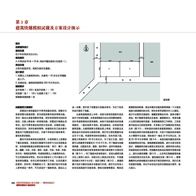 本書(shū)包括建筑快題設(shè)計(jì)的基礎(chǔ)知識(shí)及知名設(shè)計(jì)院校研究生入學(xué)考試建筑快題設(shè)計(jì)案例淺析與點(diǎn)評(píng)兩部分內(nèi)容。在第一部分內(nèi)容中重點(diǎn)介紹了快題設(shè)計(jì)方法中的三大思維步驟,通過(guò)模擬試題的方案演示闡述了思維步驟的具體運(yùn)用。第二部分選擇了9 所知名設(shè)計(jì)院校研究生入學(xué)試卷(含初試、復(fù)試和保送考試試題)的共16 套考題,對(duì)每套考題做了淺析;挑選了80 份優(yōu)秀試卷的案例并做了點(diǎn)評(píng)。同一考題有幾個(gè)不同的案例,希望讓讀者進(jìn)行橫向比較,從每個(gè)案例中找到一些值得借鑒的地方,對(duì)讀者有所啟發(fā)就是本書(shū)的意義了。