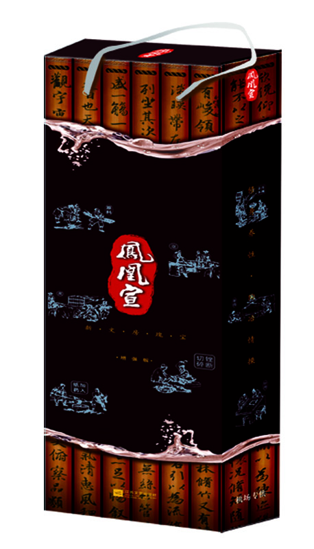 包裝:外盒四色印刷,鳳凰宣三個字加UV,配一雙繩硬提袋,內盒鳳凰紋金卡紙