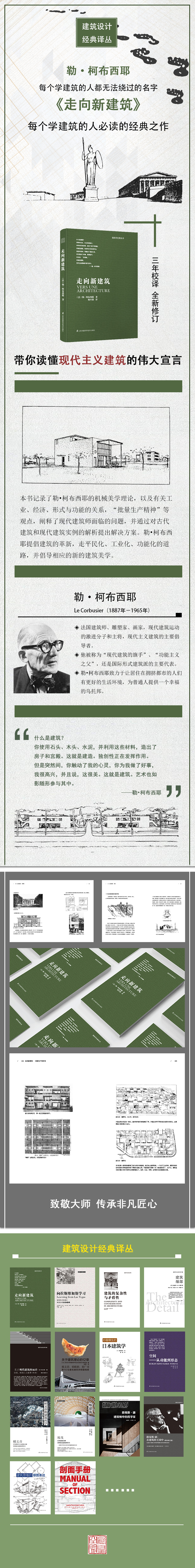 全世界建筑專業(yè)人士人手一冊(cè)的經(jīng)典之作。歷時(shí)三年,經(jīng)過反復(fù)地翻譯、校譯、審校,《走向新建筑》最新版終于得以出版,這本書更是對(duì)永遠(yuǎn)的建筑大師——勒?柯布西耶的致敬。每一位建筑專業(yè)的學(xué)生都應(yīng)該讀一下它。