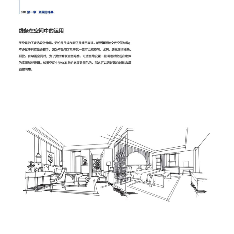《室內(nèi)設計手繪基礎與空間表現(xiàn)》主要從室內(nèi)設計手繪的基礎學習和室內(nèi)空間手繪表現(xiàn)兩個方面來詳細講解室內(nèi)設計手繪的技法。本書共分為四章,第一章,“地基 ”要打牢。著重介紹如何畫線條,線的特點以及線條如何在空間中運用。第二章,“另眼”透視。分別詳細介紹,一點透視、兩點透視、一點斜透視。第三章,眾多類型空間色稿及工具。分別分章節(jié)介紹手繪工具、馬克筆的應用、著色技巧、空間表現(xiàn)。第四章,SKETCH與局部。分別從空間草圖和陳設兩部分講解線條表現(xiàn)。