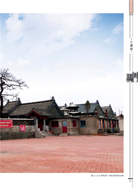 三清觀毗鄰城子坦鎮的春滿街。春滿街北面有一片海灘,往前不遠處就是碧流河匯入黃海的入海口,漲潮時,這里流動的是海水,退潮時就是河水。春滿街(圖 1)舊稱魚市街,是一條融合著遼南和膠東傳統民居特點的老街,至今仍保留著清末民初當地民居的建筑風格與空間布局,是遼寧地區目前保存最為完好,具有鮮明的歷史特色、濃郁的文化風情和較高的藝術價值的街區。