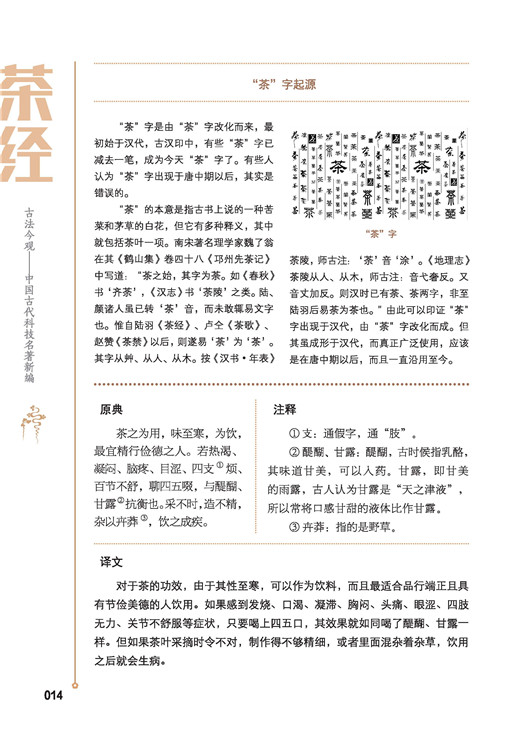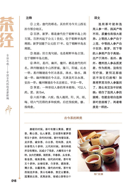 《茶經》是我國第一部系統地總結唐代及唐代以前有關茶事的綜合性茶業著作,也是世界上第一部茶書,在當時就已競相傳抄。《新唐書隱逸傳》說陸羽著《茶經》后“天下益知飲茶矣”。當時賣茶的人甚至將陸羽塑成陶象置于灶上,奉為茶神。本書除對茶經進行忠實的譯注外,更新增了現代的茶知識、茶禮、茶趣、茶保健,讓愛茶人士,講究生活品質的人士更進一步提高對茶的認識。四色印刷,圖片精致,布局優雅,堪稱現代茶經,也是人民饋贈親友的高品質禮品。