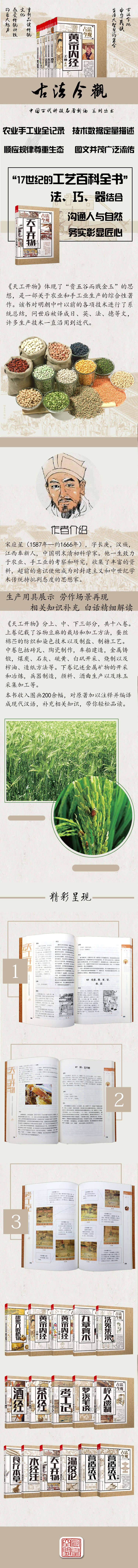 本書采用圖文并茂的形式,為今天的讀者閱覽輝煌燦爛、博大精深的國學(xué)文化提供一條捷徑,引領(lǐng)讀者走進(jìn)一片源遠(yuǎn)流長、光輝燦爛的文化天地,讓讀者感受到中國古代科技的力量與理趣,而將原著編譯成了現(xiàn)代漢語并加以注釋,進(jìn)一步拉近了遙遠(yuǎn)文化與現(xiàn)代人的距離。值得一提的是,本書收入圖畫200 余幅,既生動地展示了古代生產(chǎn)用具和生產(chǎn)場景,又體現(xiàn)了高超的農(nóng)業(yè)和手工業(yè)技術(shù),讓人嘆為觀止。有些圖片,展示的實物在現(xiàn)實中已經(jīng)很難一見了,所以特別珍貴。