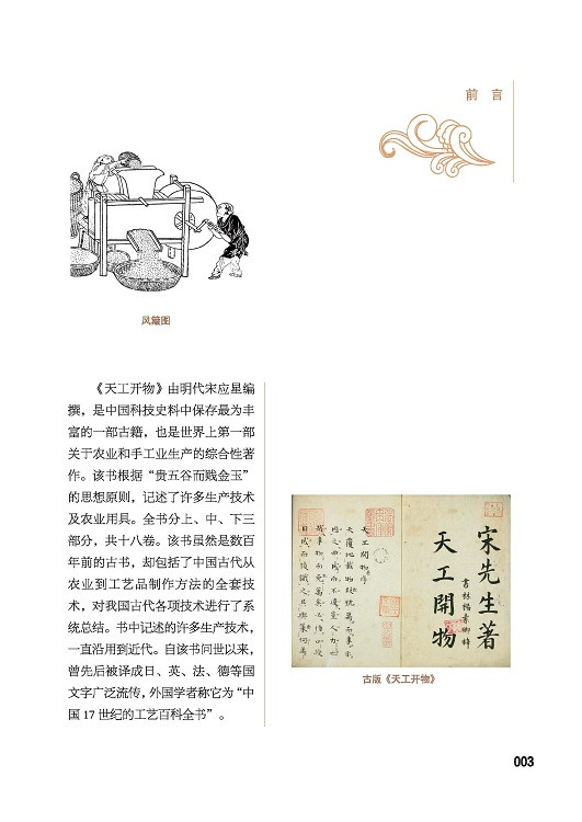 《天工開物》由明代宋應星編撰,是中國科技史料中保存較為豐富的一部古籍,是一部關于農業和手工業生產的綜合性著作。該書根據“貴五谷而賤金玉”的思想原則,記述了許多生產技術及農業用具。全書分上、中、下三部分,共十八卷。該書雖然是數百年前的古書,卻包括了中國古代從農業到工藝品制作方法的全套技術,對我國古代各項技術進行了系統總結。書中記述的許多生產技術,一直沿用到近代。自該書問世以后,曾先后被譯成日、英、法、德等國文字廣泛流傳,外國學者稱它為“中國17 世紀的工藝百科全書”。