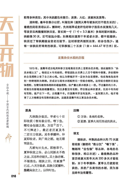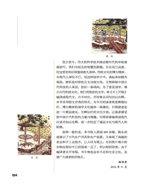 本書采用圖文并茂的形式,為今天的讀者閱覽輝煌燦爛、博大精深的國學文化提供一條捷徑,引領讀者走進一片源遠流長、光輝燦爛的文化天地,讓讀者感受到中國古代科技的力量與理趣,而將原著編譯成了現代漢語并加以注釋,進一步拉近了遙遠文化與現代人的距離。值得一提的是,本書收入圖畫200 余幅,既生動地展示了古代生產用具和生產場景,又體現了高超的農業和手工業技術,讓人嘆為觀止。有些圖片,展示的實物在現實中已經很難一見了,所以特別珍貴。