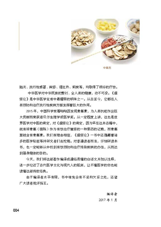 本書譯者采用圖文并茂的形式,根據(jù)書中內(nèi)容,結(jié)合注釋,匯集大量藥草圖片,方便了今天的醫(yī)學(xué)研究者對外感熱病的研究,是中醫(yī)藥研究者、學(xué)習(xí)者和中醫(yī)愛好者的重要讀物。