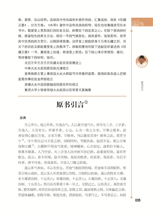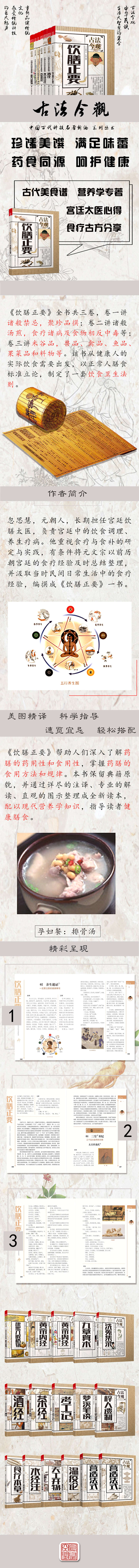 《飲膳正要》一書為元朝·飲膳太醫忽思慧所撰的一部營養學專著,全書共三卷:卷一講的是諸般禁忌,聚珍品撰;卷二講的是諸般湯煎,食療諸病及食物相反中毒等;卷三講的是米谷品,獸品、禽品、魚品、果菜品和料物等。該書記載藥膳方和食療方非常豐富,特別注重闡述各種飲撰的性味與滋補作用,并有妊娠食忌、乳母食忌、飲酒避忌等內容。它從健康人的實際飲食需要出發,以正常人膳食標準立論,制定了一套飲食衛生法則。書中還具體闡發了飲食衛生,營養療法,乃至食物中毒的防治等。為我國現存一部完整的飲食衛生和食療專書,也是一部頗有價值的古代食譜。