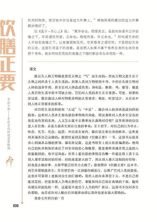 本書《古法今觀——中國古代科技名著新編 飲膳正要》除了保留典籍原貌,更加入了注釋和譯文,把原典中晦澀難懂的內容進行了現代文的翻譯,使讀者能夠無障礙的輕松閱讀,并在此基礎上引入現代營養學知識,把古時一些囿于條件限制未能全面了解的知識和錯誤的觀念進行了全面正確的闡述,使讀者既能了解古人對食物營養的追尋,更能利用更先進的手段尋找出替代品和更優化的食品,使營養學知識更豐富,更能為今人強身健體、驅除疾病所用。