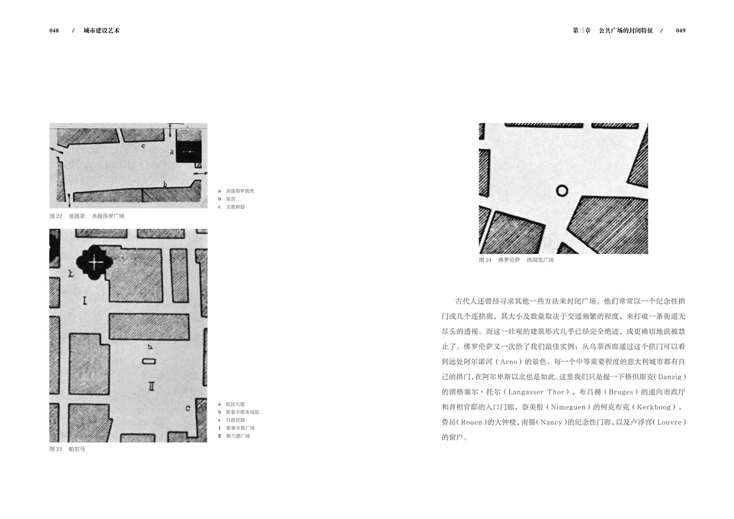 《城市建設(shè)藝術(shù)》1889年首次出版,西特考察了大量中世紀(jì)的歐洲城市與街道,通過平面圖和透視圖的相互參照,分析真正被大眾喜愛的城市空間形成的原因──并不一定是宏偉的宮殿和大尺度的廣場,而是錯落有致、互相呼應(yīng)、如畫的市內(nèi)風(fēng)景。強調(diào)自由靈活的設(shè)計,建筑之間的相互協(xié)調(diào),以及廣場和街道組成圍和而不是流動的空間,總結(jié)出適合城市建設(shè)的藝術(shù)原則。