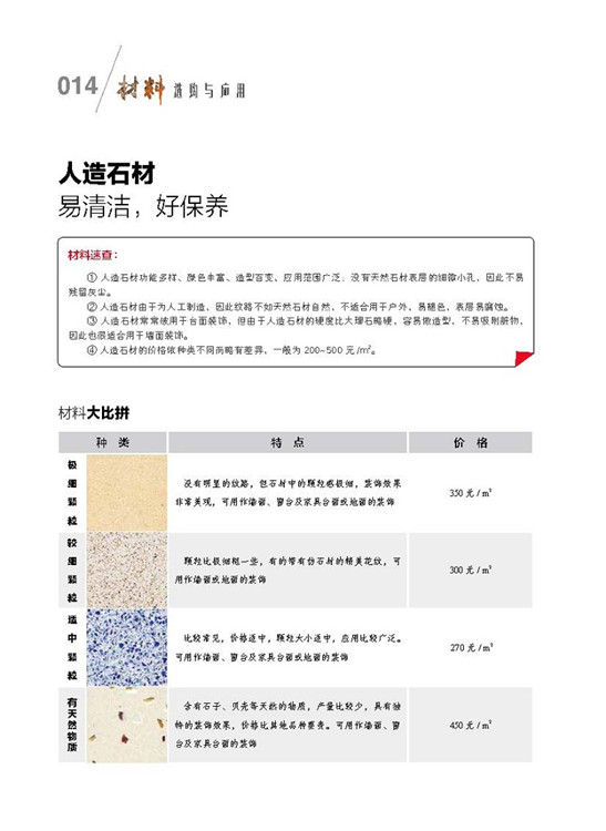 書中主體內容以模塊化的方式呈現,清晰直觀,利于閱讀,其中: “材料速查”,幫助讀者快速了解板材的基本常識;“材料大比拼”以圖解的形式幫助讀者認識建材特性、建材類別和市場價位;“施工小貼士”展示正確的施工工法;“材料搭配秘訣”則從專業的設計角度出發,令讀者可以親自設計不求人。同時附贈材料選購流程表,深度剖析材料的購買時間和應用方法。