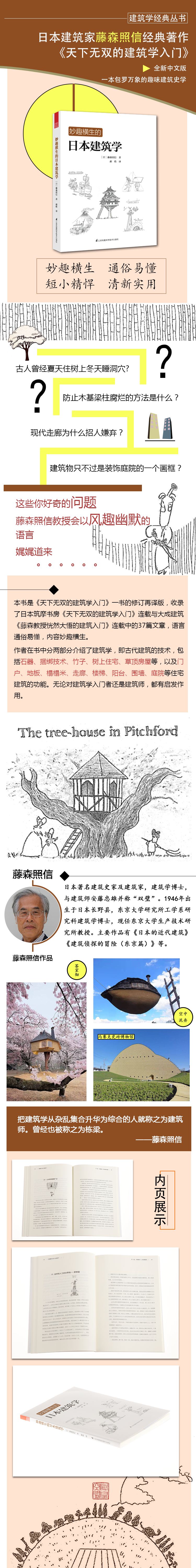 這本書是一本妙趣橫生的建筑學(xué)入門書。書中收錄了筑摩書房《天下無雙的建筑學(xué)入門》連載與大成建筑《藤森教授恍然大悟的建筑入門》連載中的37篇文章。作者在書中分為兩部分介紹了建筑學(xué),即古代建筑的技術(shù)和住宅建筑的功能。藤森照信在書中以風(fēng)趣且通俗易懂的語言詳細(xì)地地講述了日本古代建筑技術(shù),包括對(duì)石器、捆綁技術(shù)、竹子、樹上住宅、地基、柱子、草頂房屋等古代技術(shù);第二部分則詳細(xì)的講解了包括住宅、建材、門戶、地板、榻榻米、走廊、天花板、照明、窗戶、廚房、樓梯、陽臺(tái)、圍墻、庭院等現(xiàn)代住宅建筑的功能。