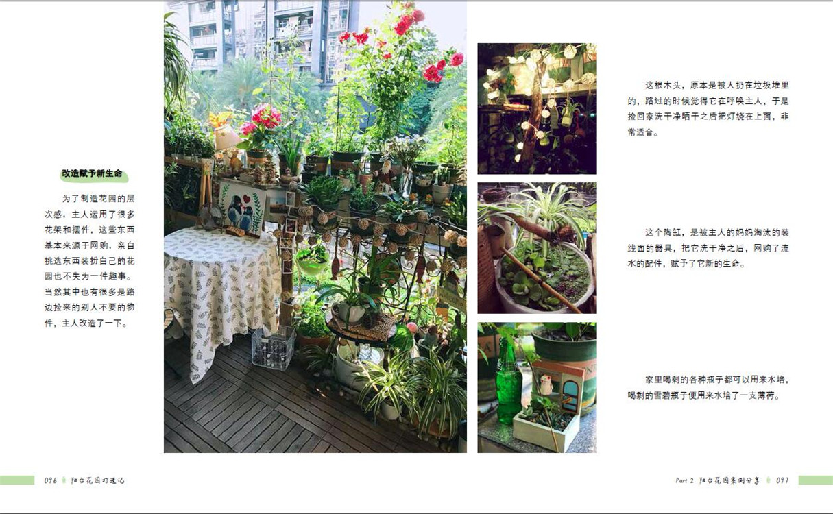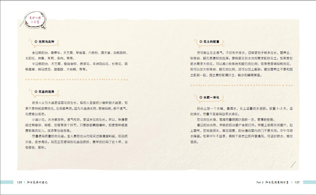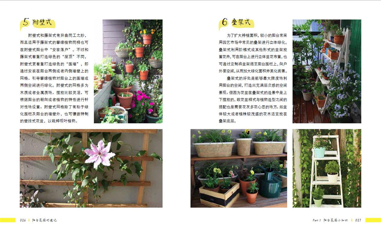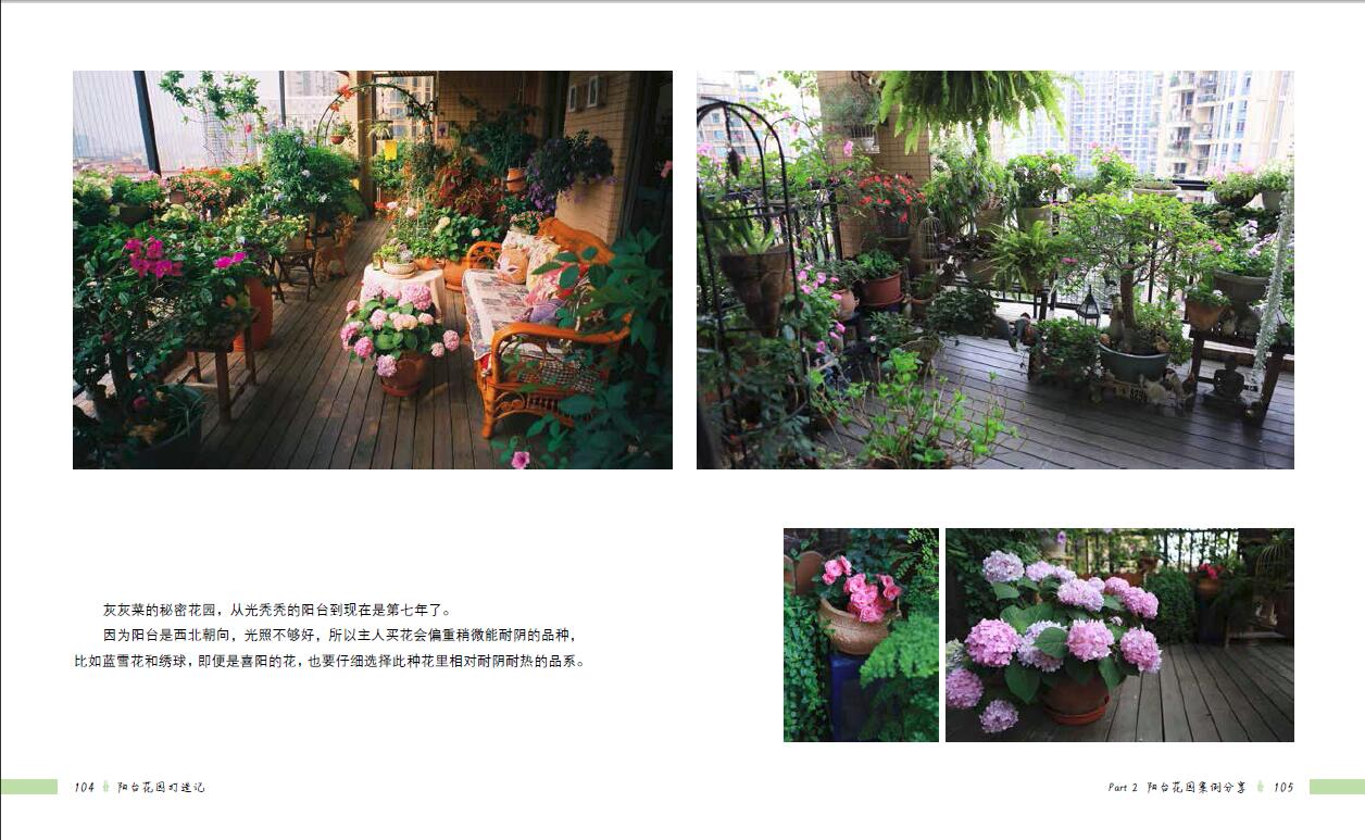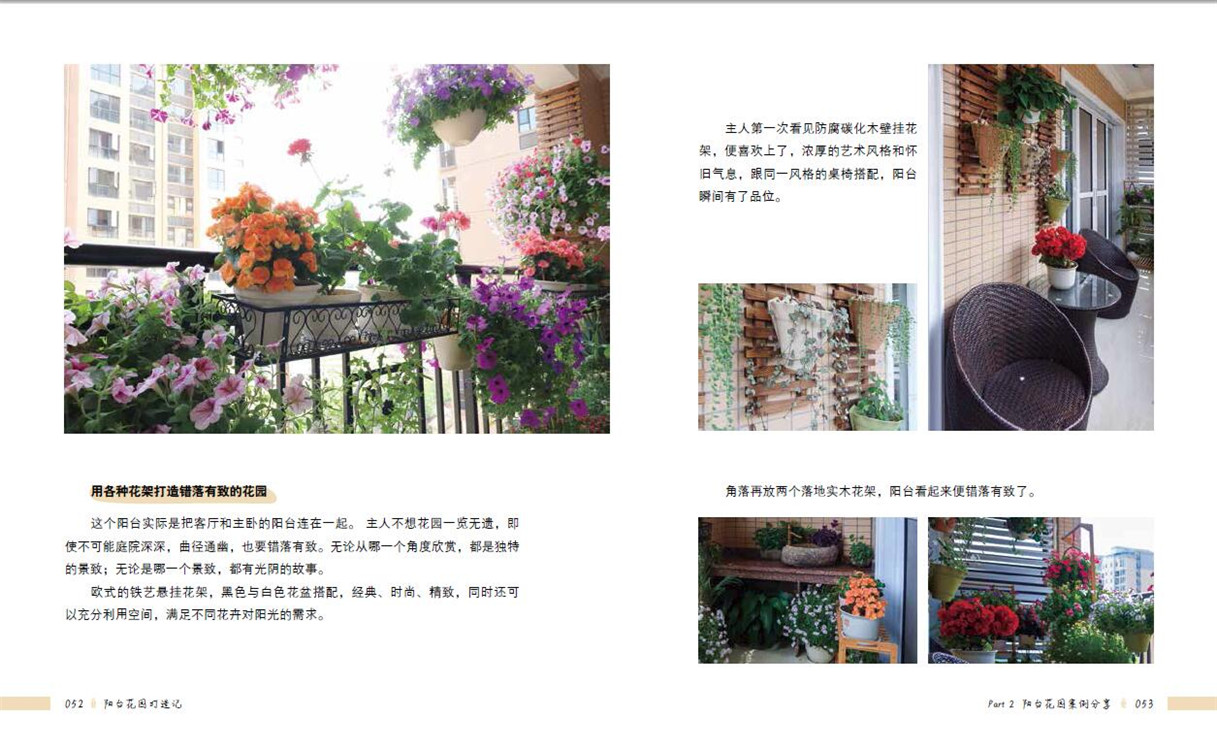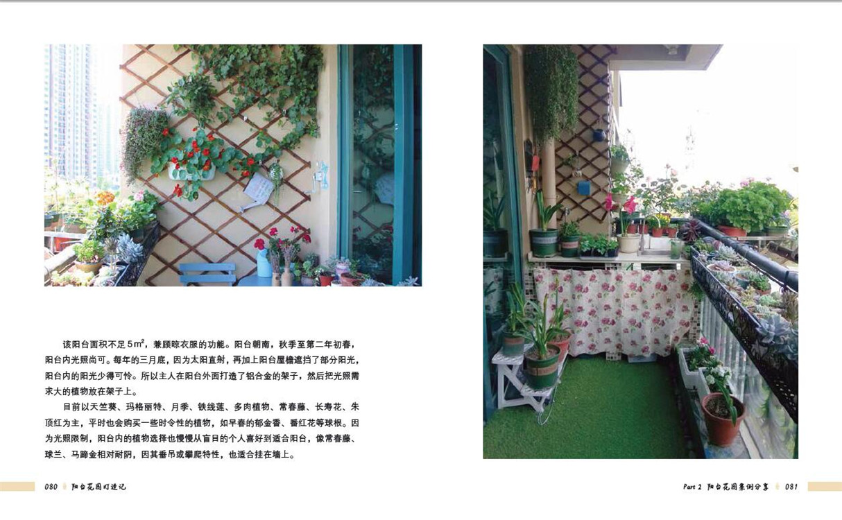 全書分為兩大部分,前面部分介紹陽臺花園的小知識,包括陽臺環(huán)境、陽臺園藝及陽臺布置等,告訴讀者如何根據(jù)陽臺具體環(huán)境進(jìn)行陽臺植物選擇、植物養(yǎng)護(hù)、陽臺造景等。后面部分分享了十個(gè)精美的國內(nèi)陽臺花園案例,案例按朝向進(jìn)行分類,分別為南向陽臺、北向陽臺、東向陽臺及西向陽臺。這十個(gè)案例風(fēng)格、面積大小、地理位置均不一樣,能為不同類型的陽臺提供參考,且案例中分享了許多陽臺花園打造及植物養(yǎng)護(hù)的心得。
