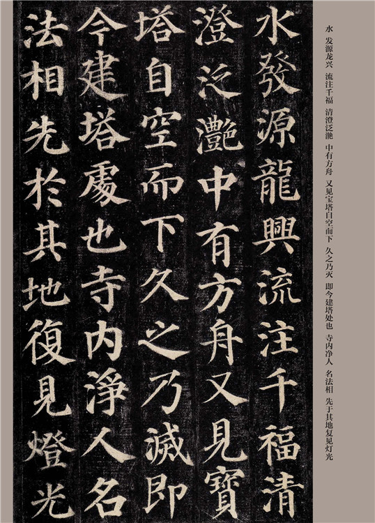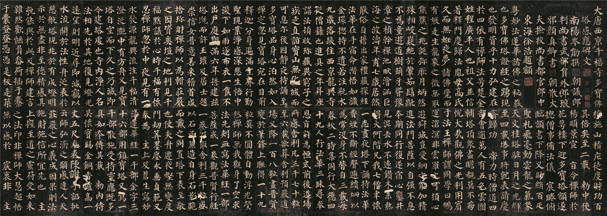 《多寶塔碑》全稱《大唐西京千福寺多寶塔感應(yīng)碑》,天寶十一年(公元752年)四月廿日建,岑勛撰文,徐浩題額,史華刻字,現(xiàn)藏于西安碑林,是顏真卿44歲時所書,也是顏真卿傳世最早之碑。《多寶塔碑》點畫豐腴,用筆勁健,結(jié)字茂密,體勢端莊。其中的點運用靈活,引帶顧盼;各筆畫間時有露鋒映帶,連貫照應(yīng),正斜相生;一些主豎故意偏離中線,而靠長橫的斜勢及長的 “力臂”和重的“垂尾”來獲取平衡,使得穩(wěn)活相生,奇趣頓增。書體雖筆力雄渾厚重,卻墨酣意足,在筆墨流動處頗顯媚秀之姿,也成就 了顏楷的“雄媚”書風(fēng)。顏真卿的楷書平畫寬結(jié)顯然是汲取了漢隸之體勢,點畫渾厚而蒼勁顯然是汲取了篆書的筆意,看似平正但絕不板滯,看似豐肥而實具風(fēng)骨,看似濁而實清,看似拙而實巧,莊而不險,從容從法度中來。蘇軾評其書謂:“一魯公書雄秀獨出,一變古法。”歐陽修《集古錄》亦曰:“斯人忠義出于天性,故其字畫剛勁獨立,不襲前跡,挺然奇?zhèn)ィ兴破錇槿恕!庇^顏真卿的楷書,字里行間,洋溢著一種正氣,如大臣正色嚴立于廟堂,有凜然不可犯之色。