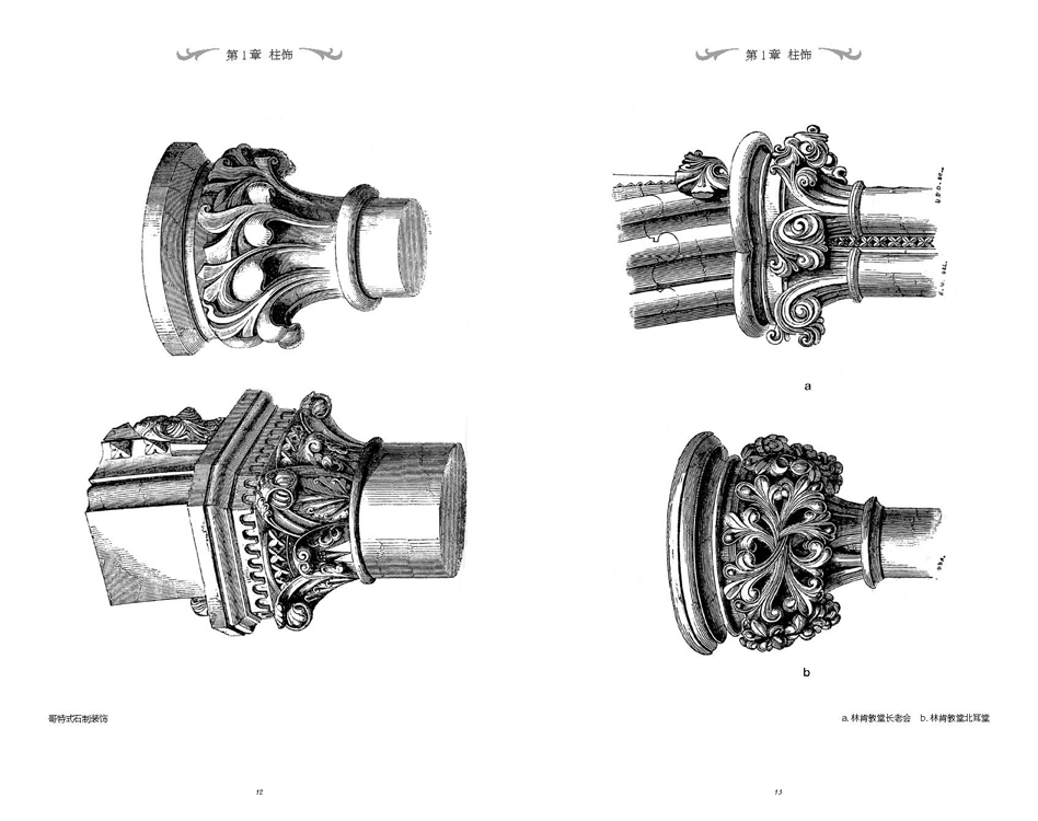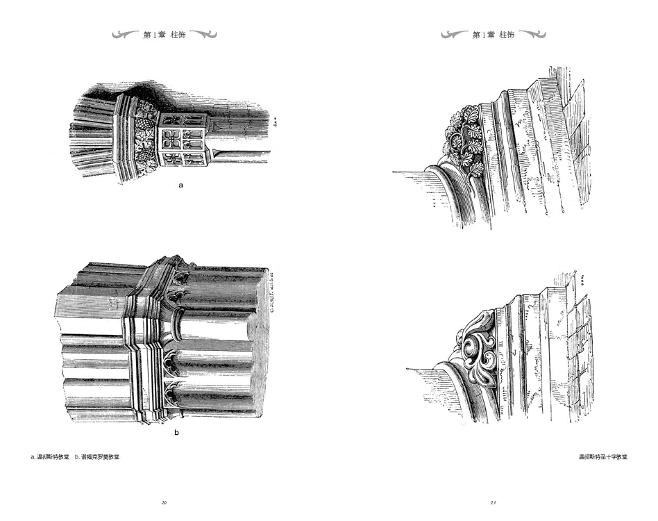 《哥特建筑與雕塑裝飾藝術(shù) 第3卷》這本畫卷是從兩本成書于18世紀末19世紀初的的公版書《哥特式藝術(shù)——以大不列顛建筑的豐富細節(jié)與配飾為實例》(上下卷)、《哥特式建筑的細節(jié)(上下卷)》中整理而成。主要介紹了哥特風格裝飾藝術(shù)的雕塑、紋樣細部與配飾。本卷共分為22章,展示了柱飾、門、窗、托架、頂飾及十字架、金屬及木質(zhì)裝飾、扶壁及女兒墻、拱廊、內(nèi)拱及門廊、拱肩、束帶層及檐口、托架、屋頂及頂棚、圣壇、卷葉、花飾、披水石、切角端部及垂飾、底座線腳及石制嵌板、尖拱及槍眼、座椅及裝飾、隔屏及嵌板、拱心石及肋上的凸飾、獸面飾及雕像、圣堂穹頂及洗禮盆裝飾、排水石盆及牧師席、彩畫、金屬及木質(zhì)裝飾等裝飾細節(jié),圖片品質(zhì)高,近半數(shù)的圖附剖面(斷面)圖。