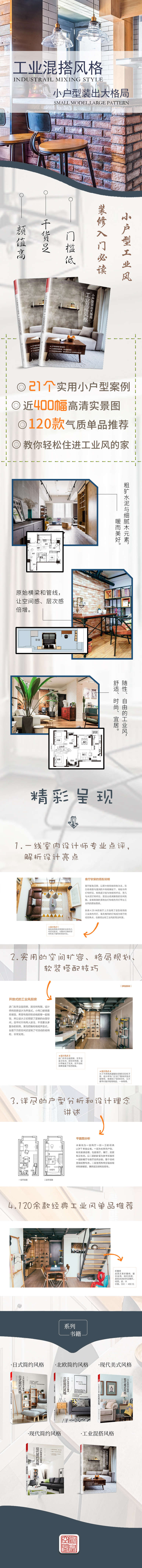 本書是一本實用型小戶型家裝參考書,精選國內(nèi)一線設(shè)計工作室的21個優(yōu)秀的工業(yè)混搭風(fēng)格的實景案例,每套案例一個主題,并配有戶型圖解析和設(shè)計理念介紹。編者從室內(nèi)設(shè)計的專業(yè)角度分析了小戶型的裝修特點,并從軟裝、色彩、材料、住宅的功能分區(qū)、收納儲物等角度全面講解了在小戶型裝修過程是怎樣合理規(guī)劃空間布局和從視覺、功能使用上增大空間面積。全書案例詳細說明了所用的主要裝修材料和設(shè)計要點,全方位講解工業(yè)混搭風(fēng)格的裝修理念,并對案例中出現(xiàn)的工業(yè)風(fēng)單品做以簡單介紹,實用性非常強。