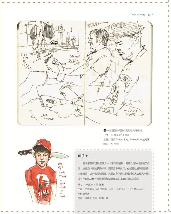 從這本書中我們可以學(xué)到很多。要從掌握人物比例開始,學(xué)會輪廓速寫,抓住人物的動態(tài),關(guān)注情感和環(huán)境。要超越技術(shù)層面,更多考慮人物的精神所在:人物繪畫是了解社會的重要方式之一。一個陌生人可能不愿意被拍照,但我也找到了一些人,他們雖然有點害羞,不過還是愿意當(dāng)我的模特,把某些瞬間留在畫紙上。