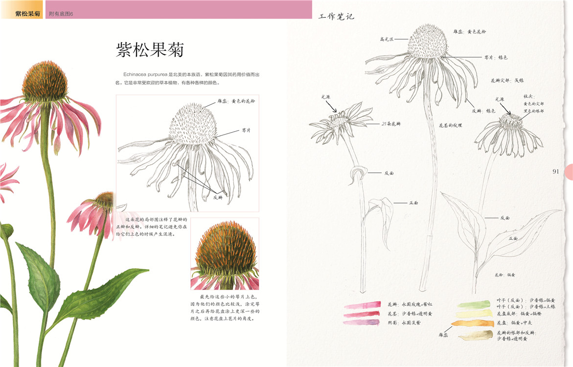 必備的畫前準備后,是藝術家對造型和設色的講解,掃除你的入門疑慮。之后出場的是有充分詳解步驟的繪畫案例,玫瑰、馬蹄蓮、鳶尾……你肯定會喜歡。充分的練習后,需要反思總結,藝術家在這里列出上色的六個階段,這有助于你更精準地使用顏料,幫你走向真正的植物繪畫。