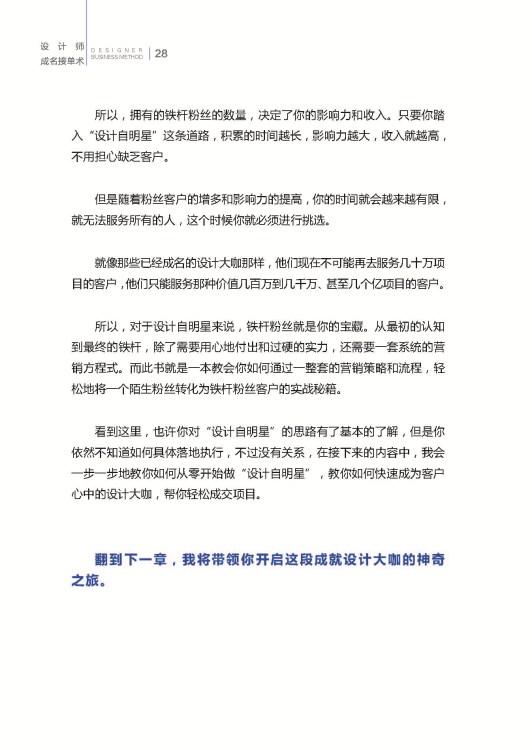 本書分為九個版塊,從設計師成名經濟概論到成就明星設計師接單的具體執行細節、營銷手段都一一講解,從個人定位到如何吸引粉絲,從形象包裝到價值輸出,從挖掘客戶到建立接單系統等,形成一整套營銷及接單體系,讓設計師通過自媒體成為客戶心中的設計大咖,從此擁有輕松接單、瀟灑生活的精彩人生。