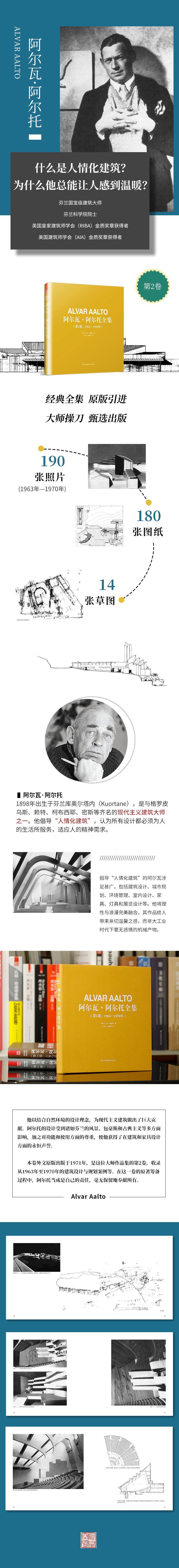 本卷外文原版出版于1971年,是這位大師作品集的第2卷,收錄從1963—1970年的建筑設(shè)計(jì)與規(guī)劃案例等,包括文化中心、劇院、博物館、圖書館和教堂等。在這一卷的原著籌備過程中,阿爾托當(dāng)成是自己的責(zé)任,毫無保留地奉獻(xiàn)所有。本書沒有將阿爾托的建筑設(shè)計(jì)歸類于某種風(fēng)格或流派,也沒有對(duì)他的作品小題大做,只是將他的建筑設(shè)計(jì)忠實(shí)、客觀、簡(jiǎn)要地展示與陳述給讀者。