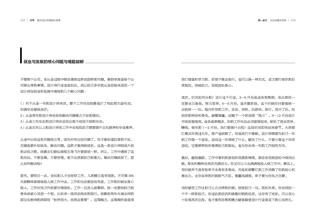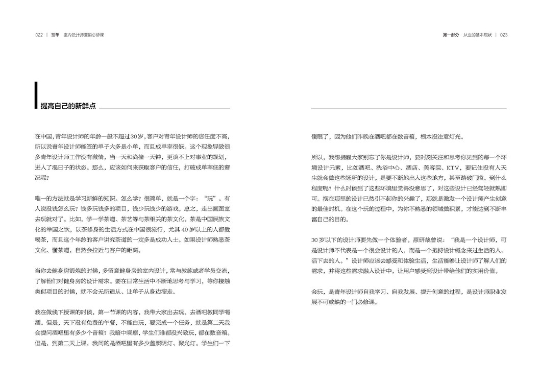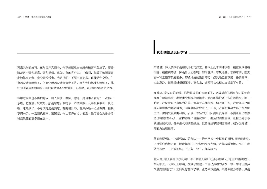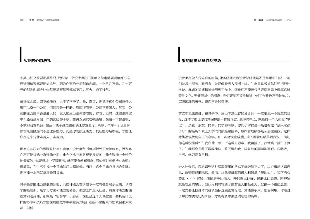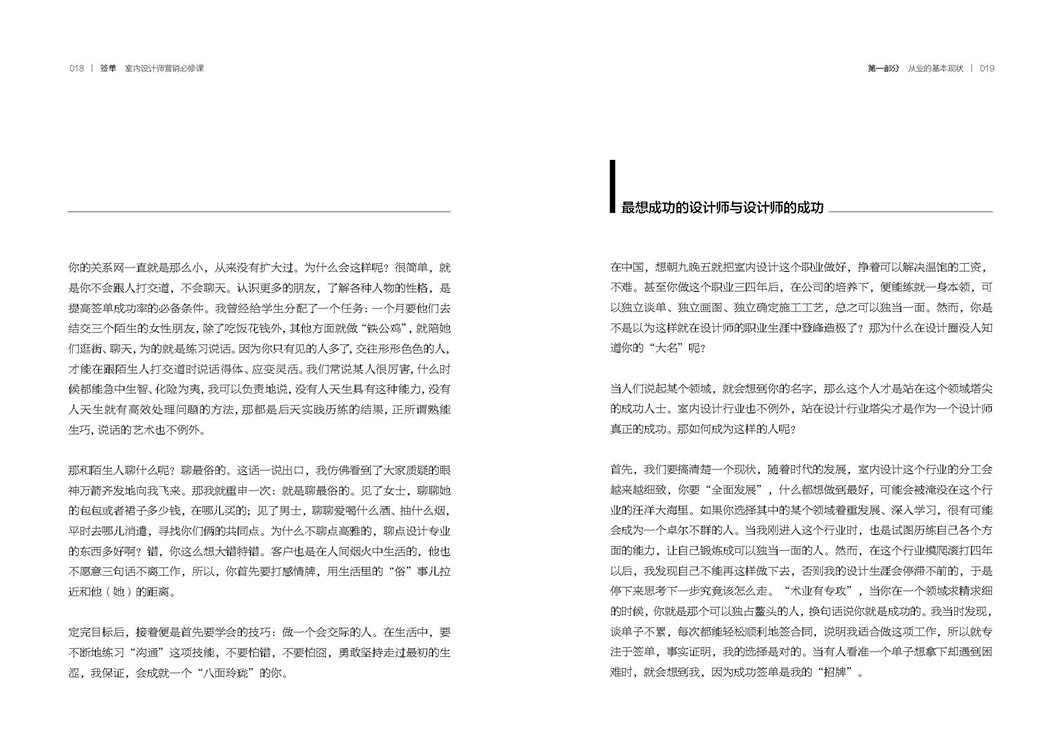 兒應(yīng)聘到一家企業(yè),從打掃衛(wèi)生開始,靠著自己的努力和勤奮爬到了CEO 的位置,到達(dá)她職業(yè)生涯的頂峰。我們可以把眼光放得長(zhǎng)遠(yuǎn)一點(diǎn),讓自己的視野開闊一些。假想一下,如果忽略你所服務(wù)的小公司的概念,把中國(guó)室內(nèi)設(shè)計(jì)想象成一個(gè)大公司,你是中國(guó)室內(nèi)設(shè)計(jì)這個(gè)大公司的一個(gè)職員。既然你在一個(gè)公司供職,那就要不斷努力地尋找晉升機(jī)會(huì),你就一定會(huì)成為設(shè)計(jì)總監(jiān)或者CEO,最后讓自己達(dá)到引領(lǐng)整個(gè)室內(nèi)設(shè)計(jì)行業(yè)的高度。所以你見的每一個(gè)客戶、談的每一個(gè)單子,都是你的職業(yè)晉升的資本,都必須認(rèn)真對(duì)待。即使這單費(fèi)了九牛二虎之力最終沒談成,也要面帶微笑地歡送這個(gè)客戶。這不光是工作的歷練,更是好人品的累積。我們來(lái)做一個(gè)簡(jiǎn)單的加法:你在這家公司的第一年簽了有20 家客戶,第二年去別家公司或者還在這家公司又簽了20 家客戶,那么加上之前的就有40 家客戶,如果干了5 年,那就有100 個(gè)客戶,在這100 個(gè)客戶中就已經(jīng)有了小小的名氣。如果這100 個(gè)客戶的親戚朋友裝修時(shí)也能想到你,那么在室內(nèi)設(shè)計(jì)這個(gè)市場(chǎng)的群體里面,你就必然占有了一定的份額。