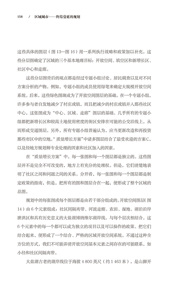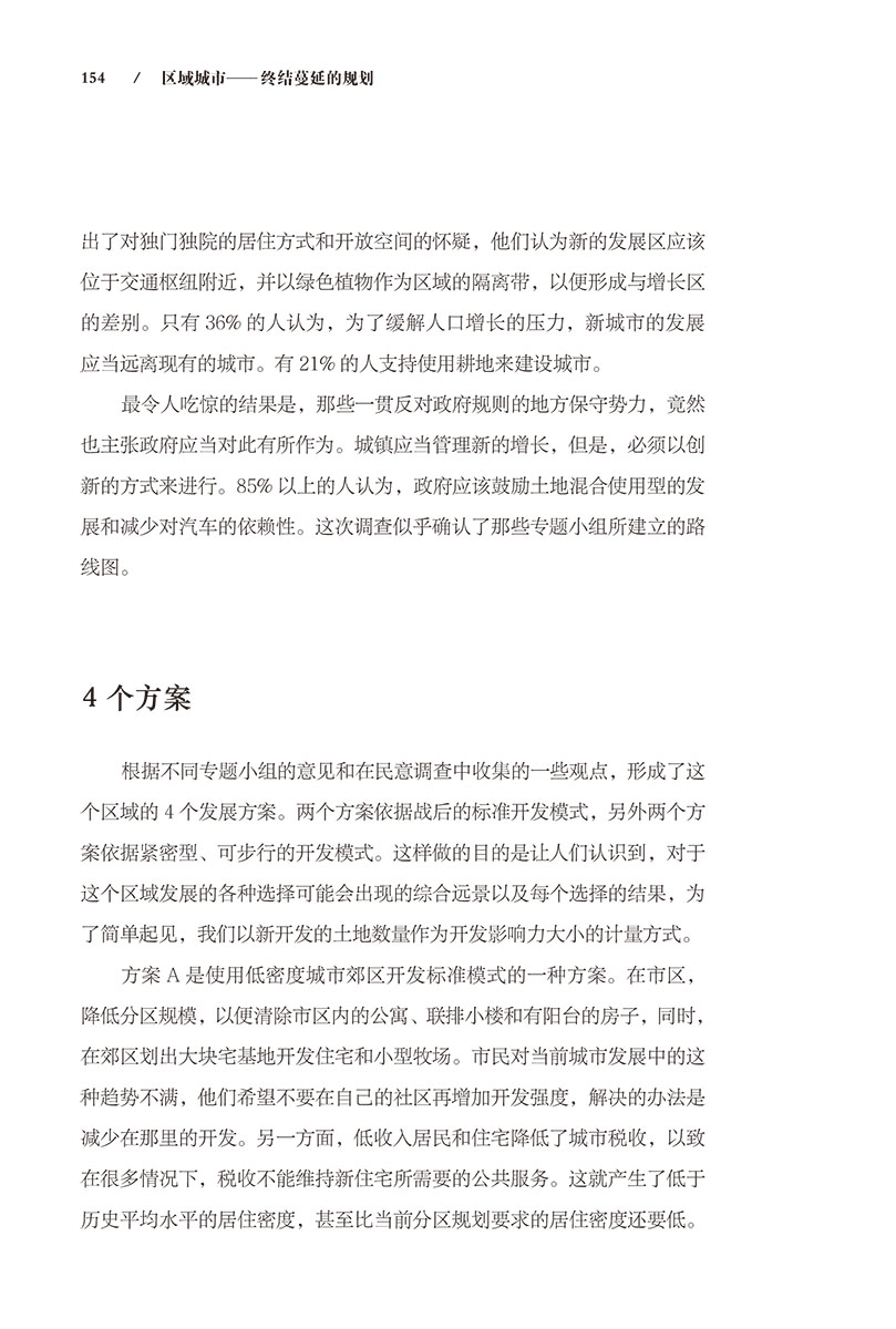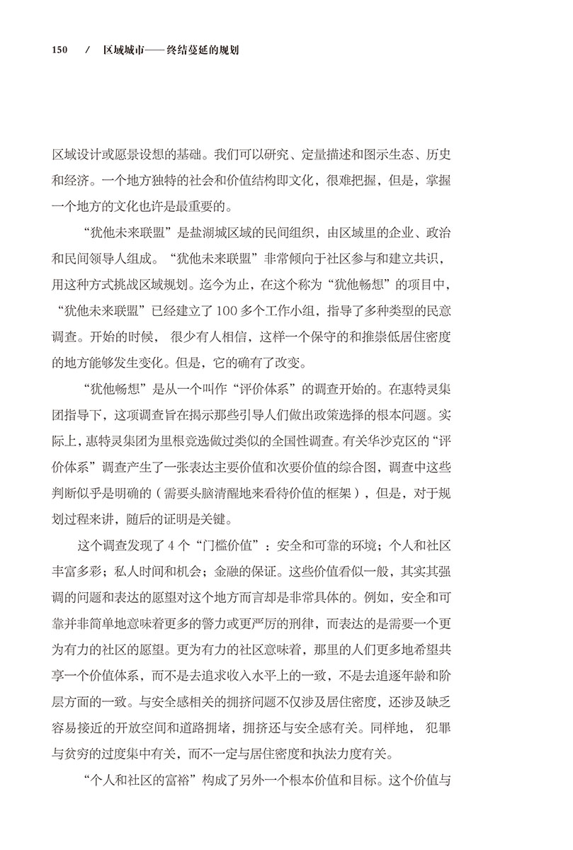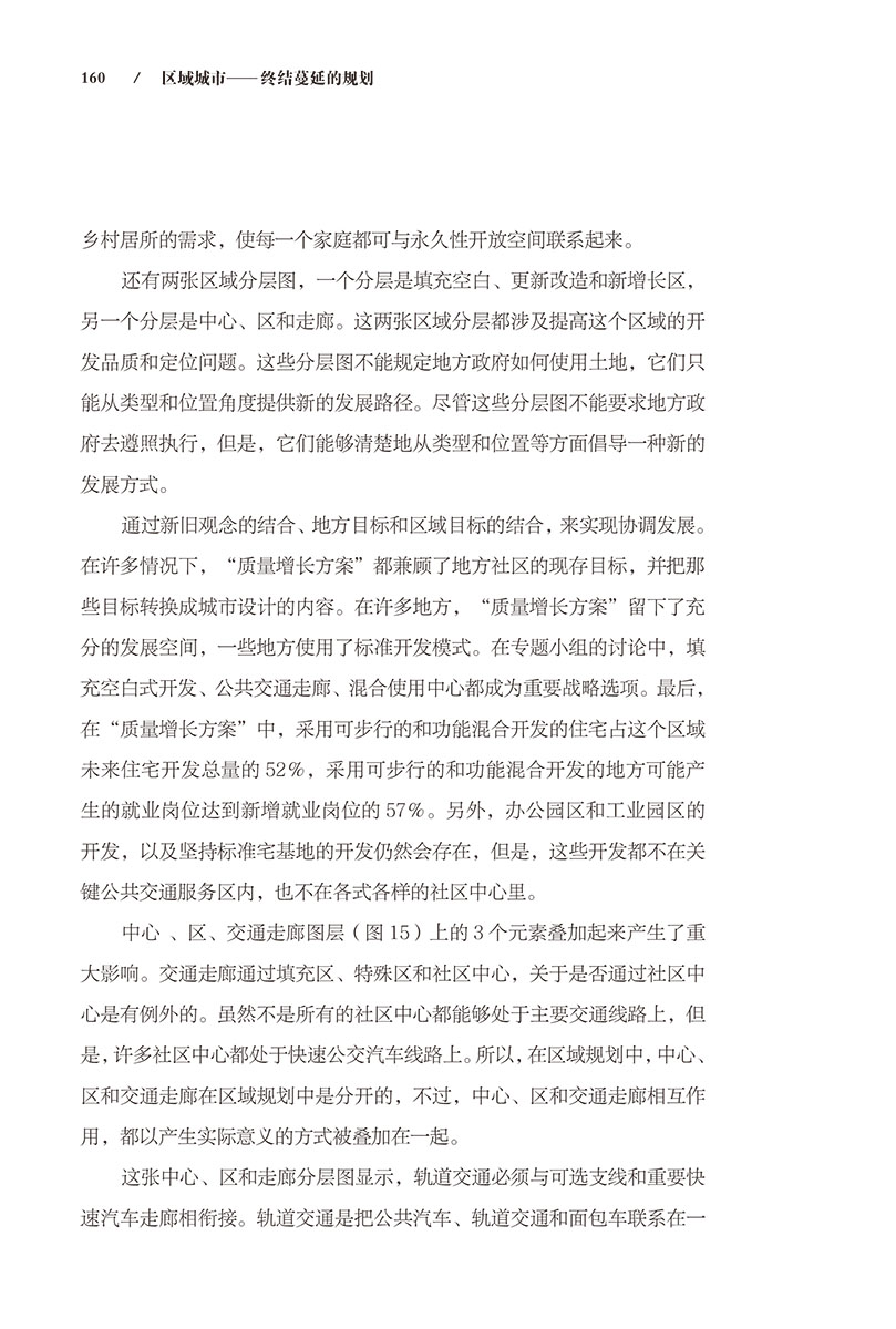 本書試圖提出區(qū)域城市的框架,考察正在興起的區(qū)域、正在展開的郊區(qū)以及得到更新改造的城區(qū)之間的關(guān)系。本書的第一部分“蔓延的終結(jié)”,提出了這種新都市形式的性質(zhì)和原則。我們認(rèn)為,不能用傳統(tǒng)的城市和郊區(qū)的理論來解釋“區(qū)域城市”, 甚至也不能把新都市形式的原則解釋為政治司法的匯編。必須從經(jīng)濟、生態(tài)和社會的角度把“區(qū)域城市”看成一個單元,它由街坊和社區(qū)綜合而成,這些街坊和社區(qū)把大都市聯(lián)合成一個整體。