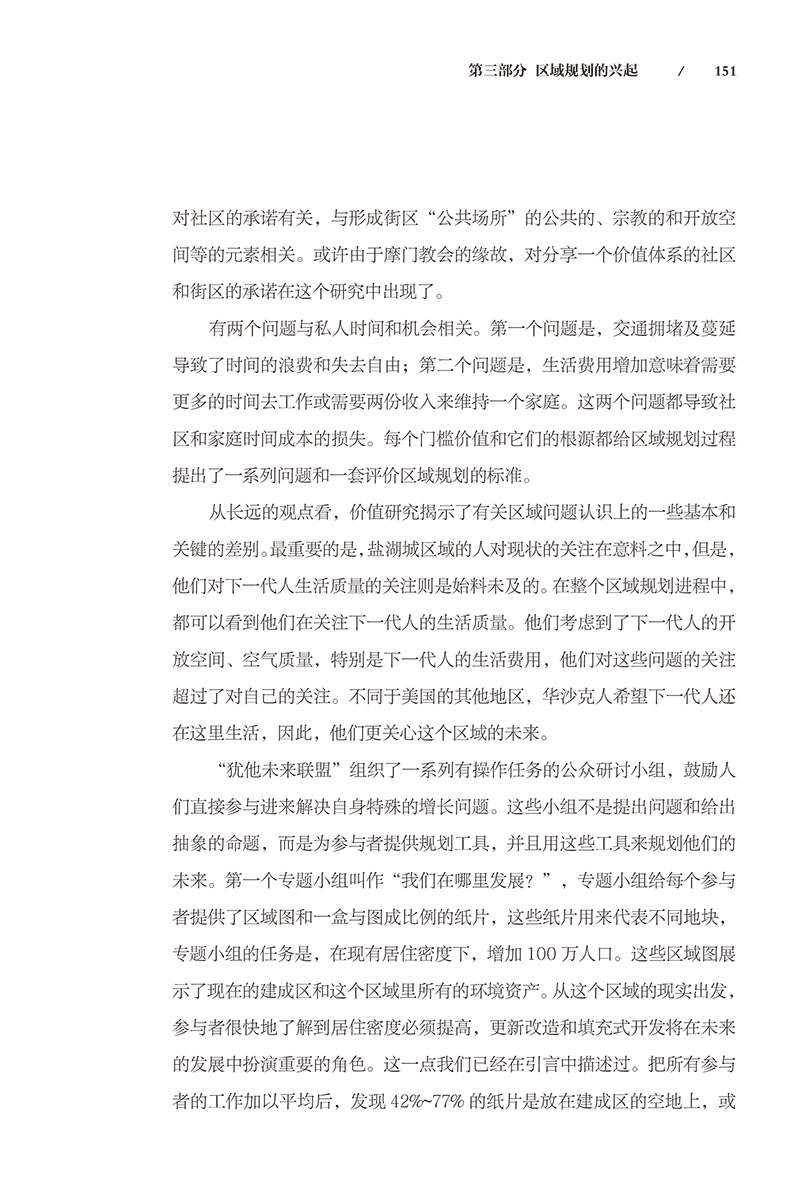 第三部分“區(qū)域規(guī)劃的興起”,記述了整個美國究竟有多少大都市正在通過形體設(shè)計、社會和經(jīng)濟政策向區(qū)域城市轉(zhuǎn)變。我們集中研究了三個走在最前列的區(qū)域城市:波特蘭、西雅圖和鹽湖城。我們也考慮到了在特大都市區(qū)域執(zhí)行區(qū)域尺度上的政策的困難,特別注意到美國州政府所扮演的潛在的角色,如佛羅里達、馬里蘭和明尼蘇達。