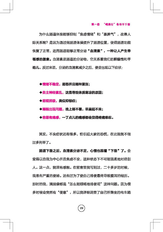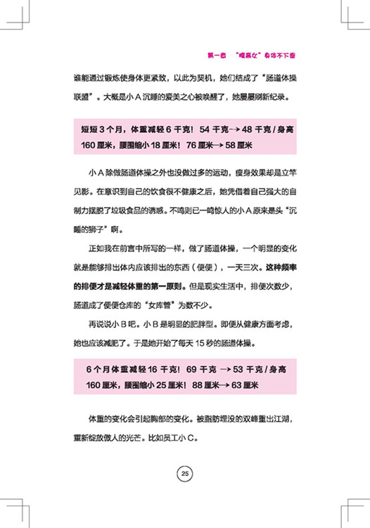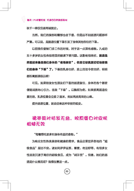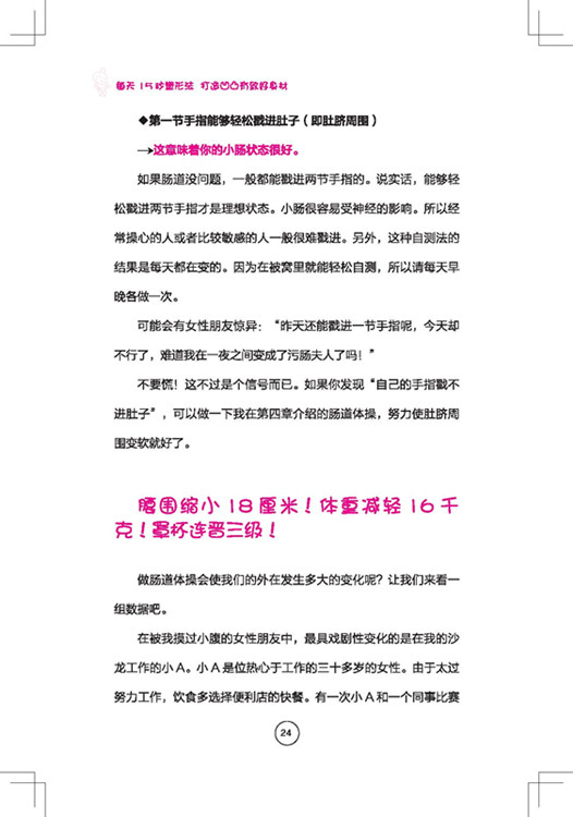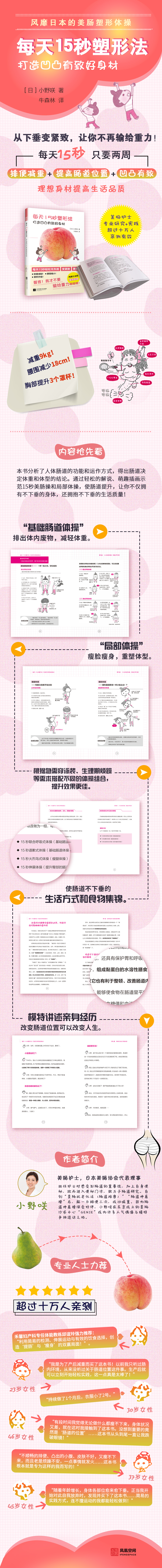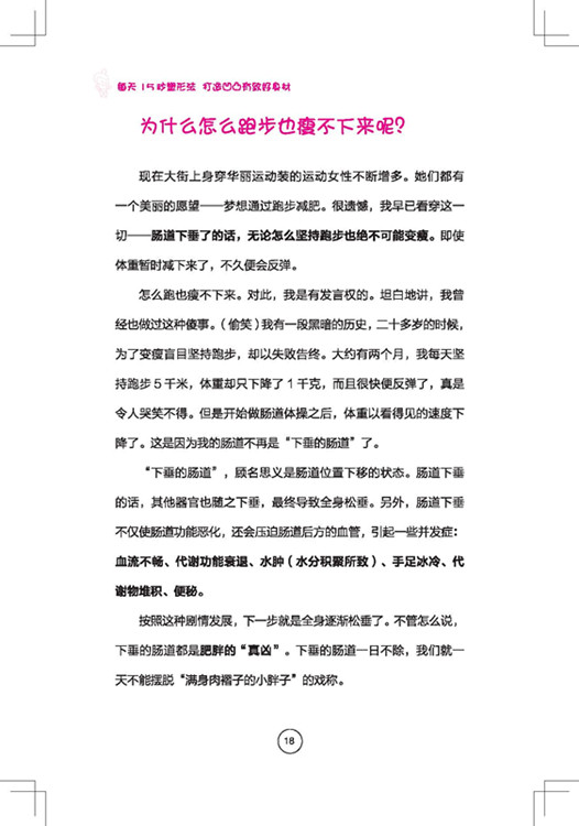 本書以女性身體不斷下垂的苦惱開篇,通過分析人體腸道的功能和運作方式,得出腸道決定體重和體型的結論。接著,詳細解說作者研發(fā)的15秒美腸操,讓腸道回到原本的位置?!盎A腸道體操”排出體內(nèi)廢物,減輕體重,“局部體操”重塑體型,打造凹凸有致好身材。此外,再搭配使腸道不下垂的生活方式和食物集錦,收獲不下垂的生活品質。最后,收錄美腸沙龍女子座談會,東京的模特紛紛感嘆改變腸道位置可以改變?nèi)松?