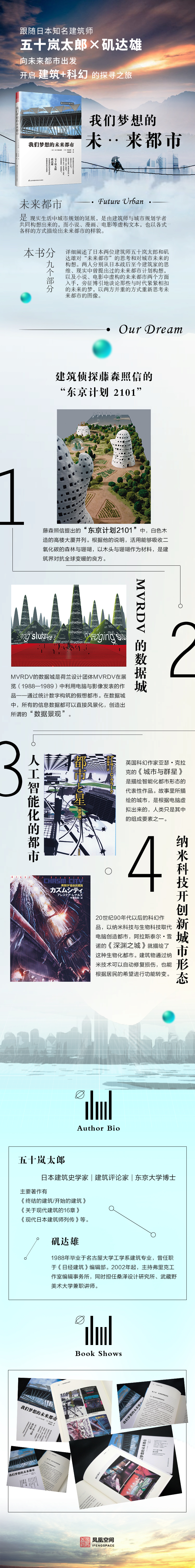 本書由建筑評(píng)論家五十嵐太郎與建筑專門記者磯達(dá)雄共同撰寫,兩人分別從日本戰(zhàn)后至今的建筑家的思維、現(xiàn)實(shí)中曾經(jīng)提出過的未來都市計(jì)劃構(gòu)想,以及小說、電影中虛構(gòu)的未來都市兩個(gè)方面入手,旁征博引地談?wù)撃切┡c時(shí)代緊緊相扣的未來的夢(mèng),也從中看見此刻指尖所指向的可能未來。