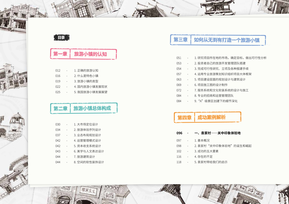 書中共包括旅游小鎮(zhèn)的發(fā)展現(xiàn)狀、旅游小鎮(zhèn)的總體構(gòu)成、如何從無到有打造旅游小鎮(zhèn)、經(jīng)典案例分析、項目操盤者常犯的的誤區(qū)五個章節(jié),圖文并茂,實用性強。