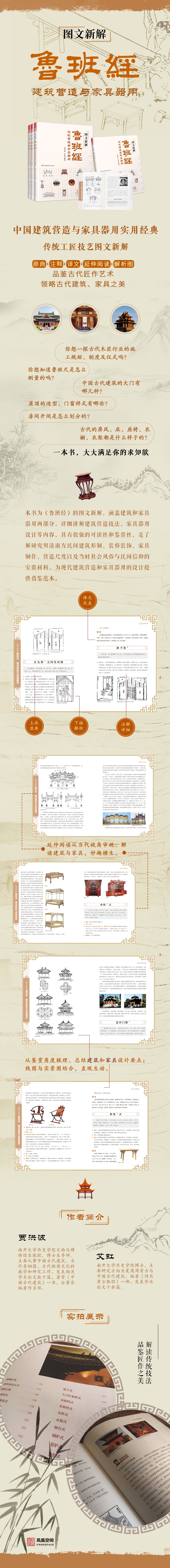 ?原書圖片與現(xiàn)代實景圖片相結(jié)合,線圖標示說明,有理有據(jù)地圖解建筑與家具的規(guī)制、做法,為讀者提供一個較為全面的《魯班經(jīng)》讀本。