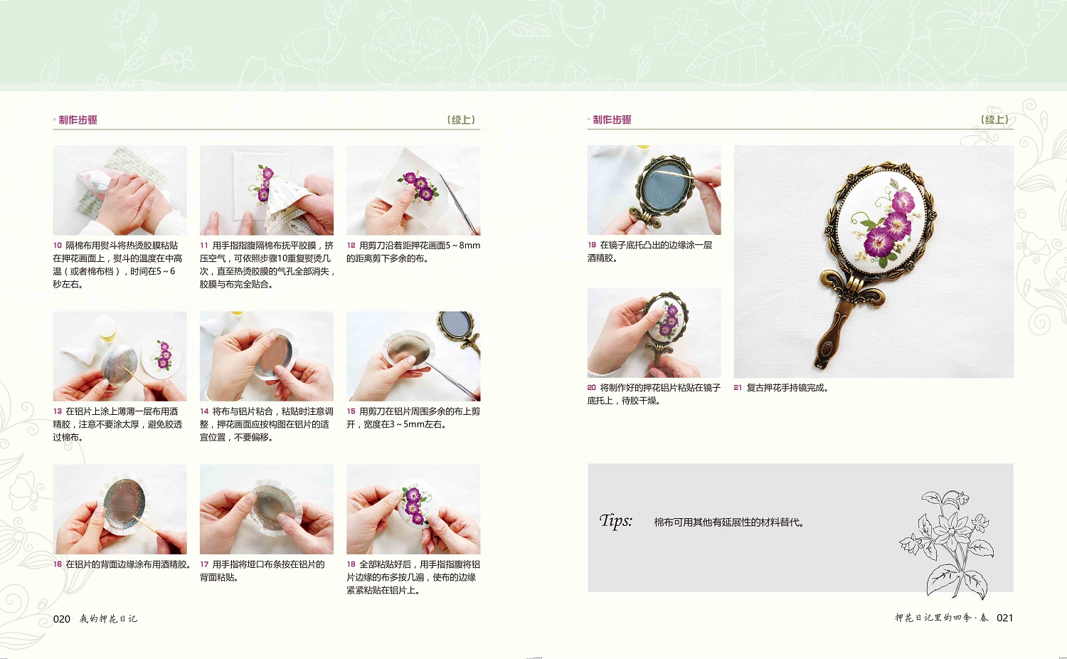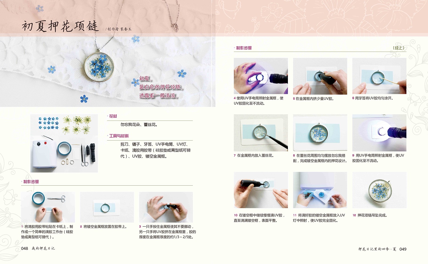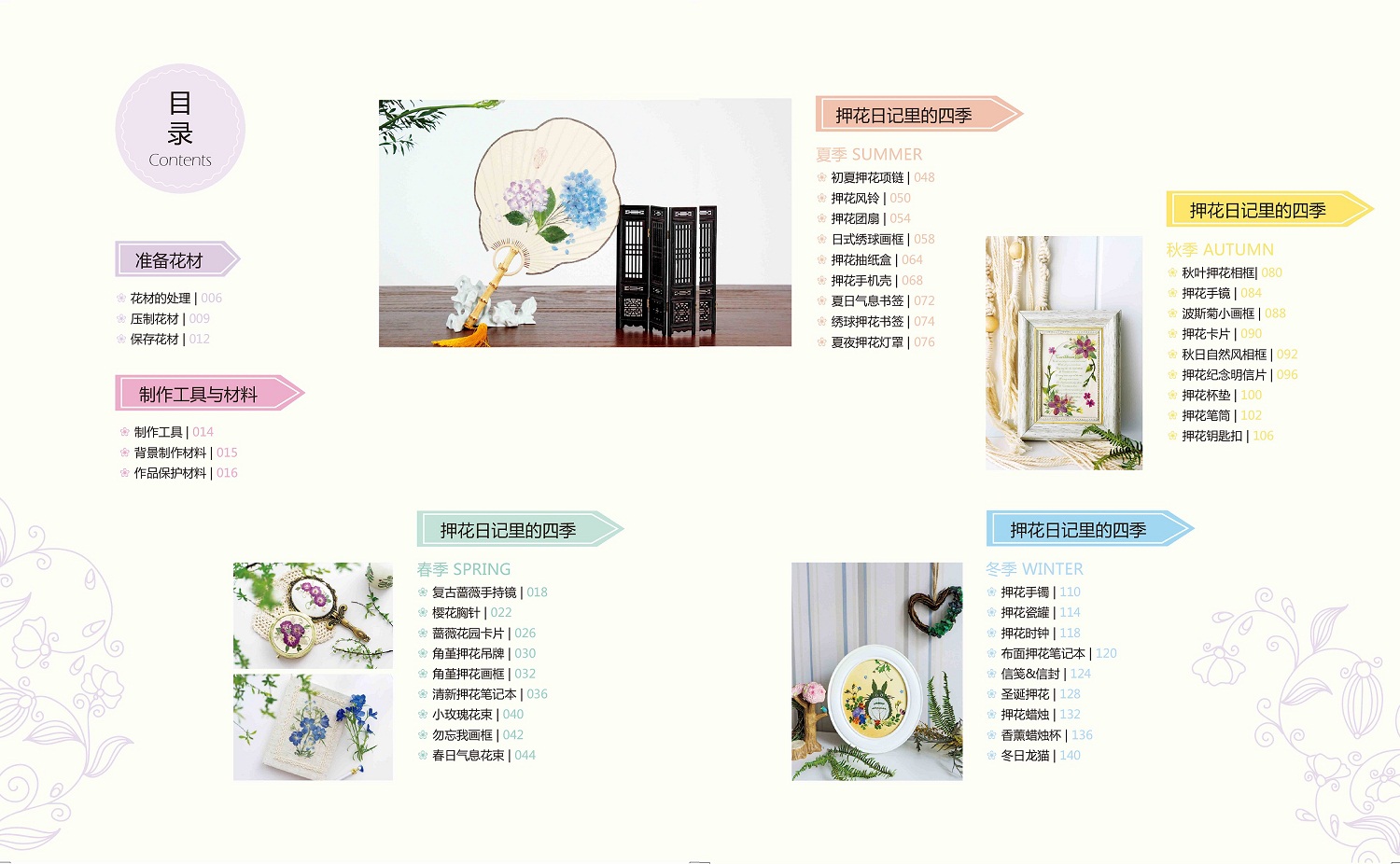 近幾年,新的押花制作方法與生活應用越來越多,人們對押花有了進一步的認識。本書共分享了36個簡單而新穎的押花作品,以春夏秋冬四個季節(jié)為線索,介紹其制作步驟和成品展示。作品均為作者精選的運用當季花材或適用于當季的精美押花小物,包括胸針、筆記本、風鈴、團扇、手機殼、手鏡、項鏈、手鐲和蠟燭等多種不同形式的押花作品。