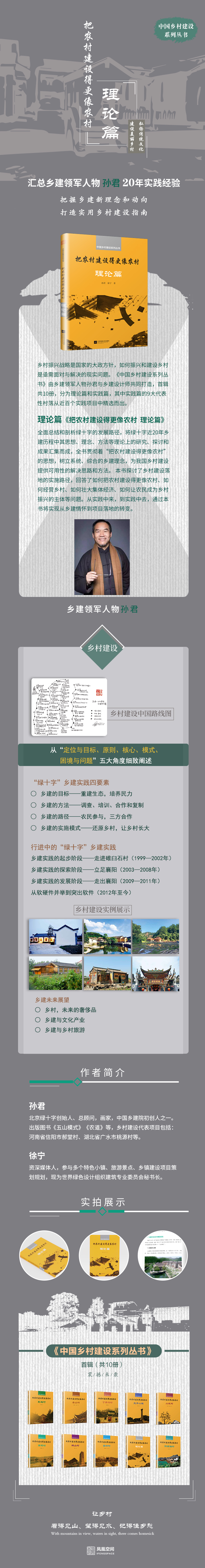 “中國鄉(xiāng)村建設(shè)系列叢書”,分為理論篇與實踐篇,共10冊。將理論運用于實踐,從實踐完善理論,您對鄉(xiāng)村建設(shè)的一切疑問,都將在本叢書中找到答案。